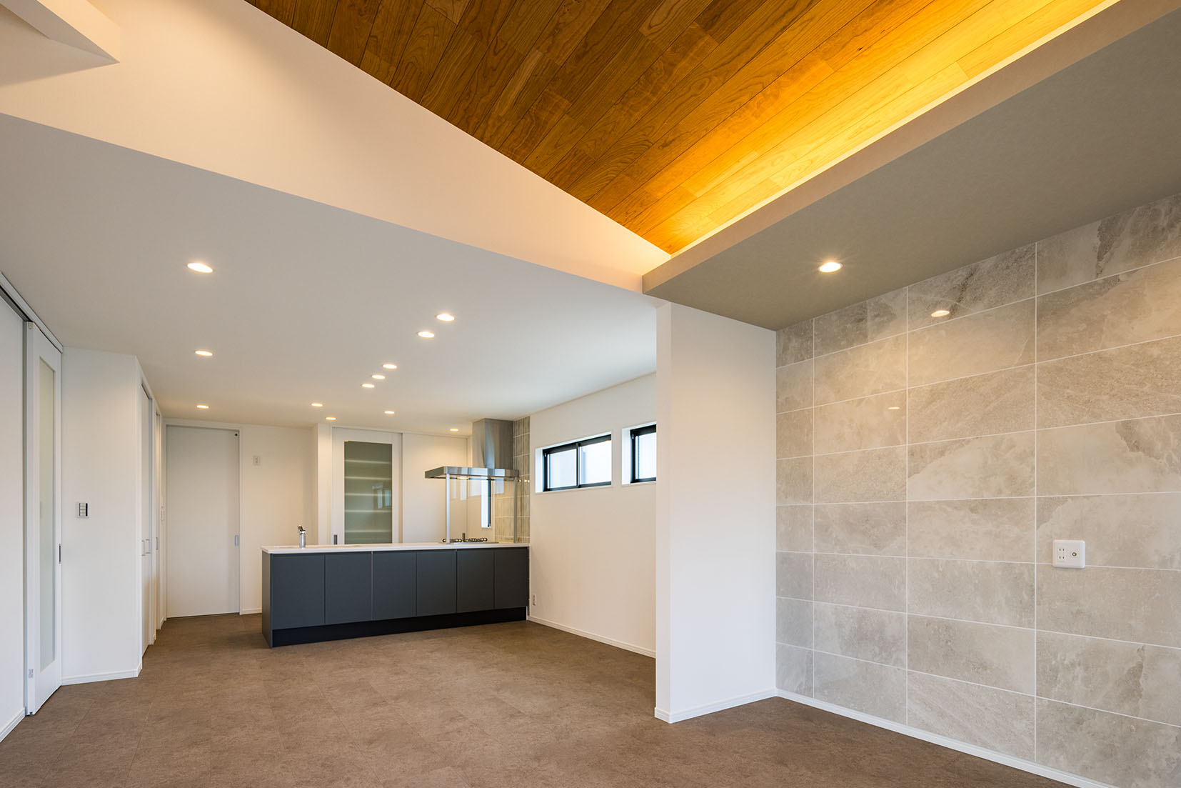 フラットで艶の美しいタイルと板張り天井で仕上げました。