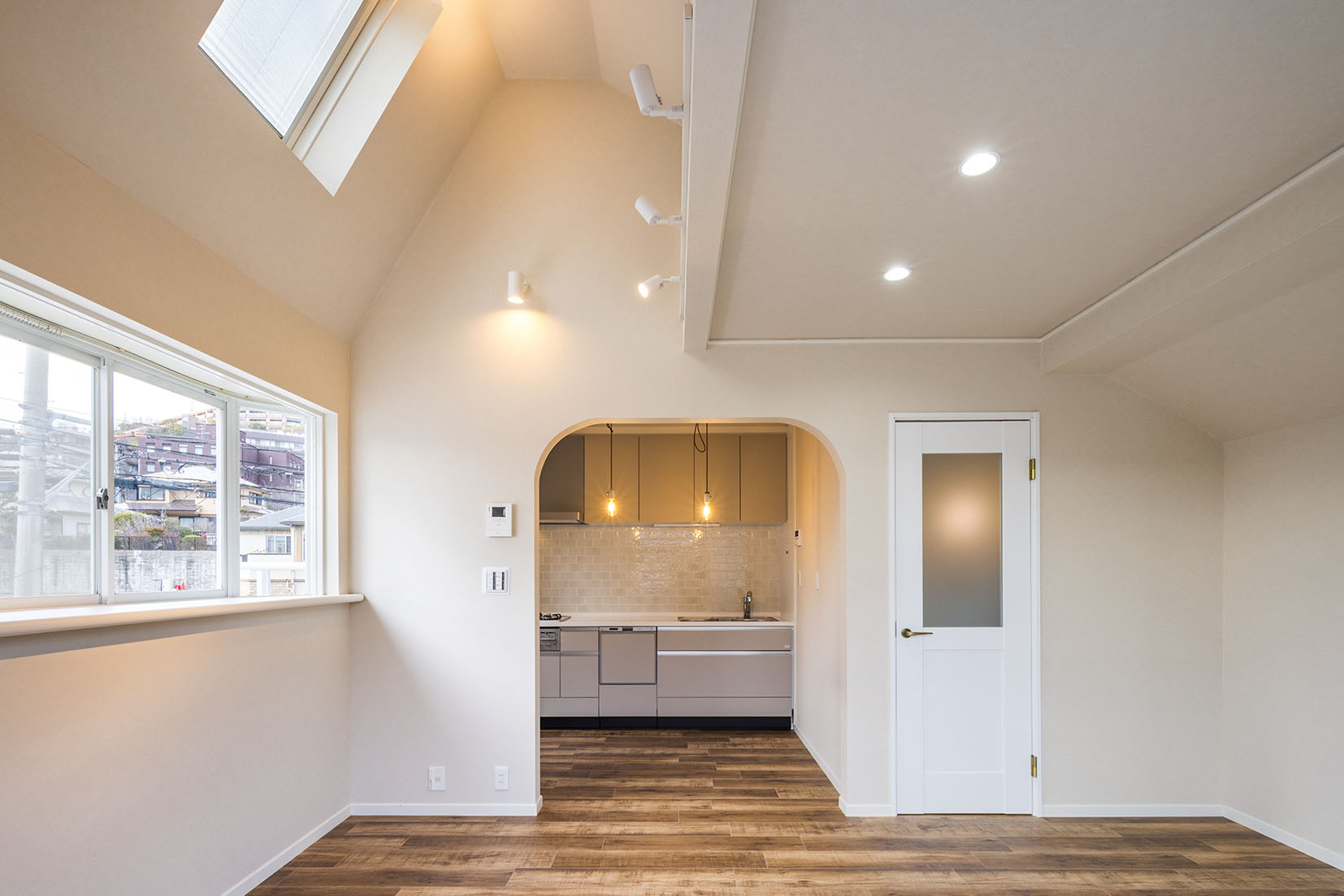 屋根勾配に合わせたリビングの勾配天井は、