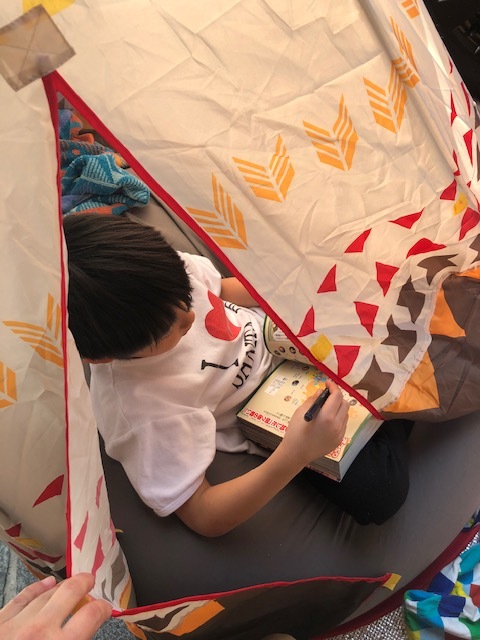子供用テントを玄関先に置いて、キャンプごっこをしてみたり。