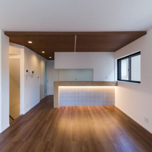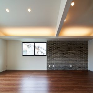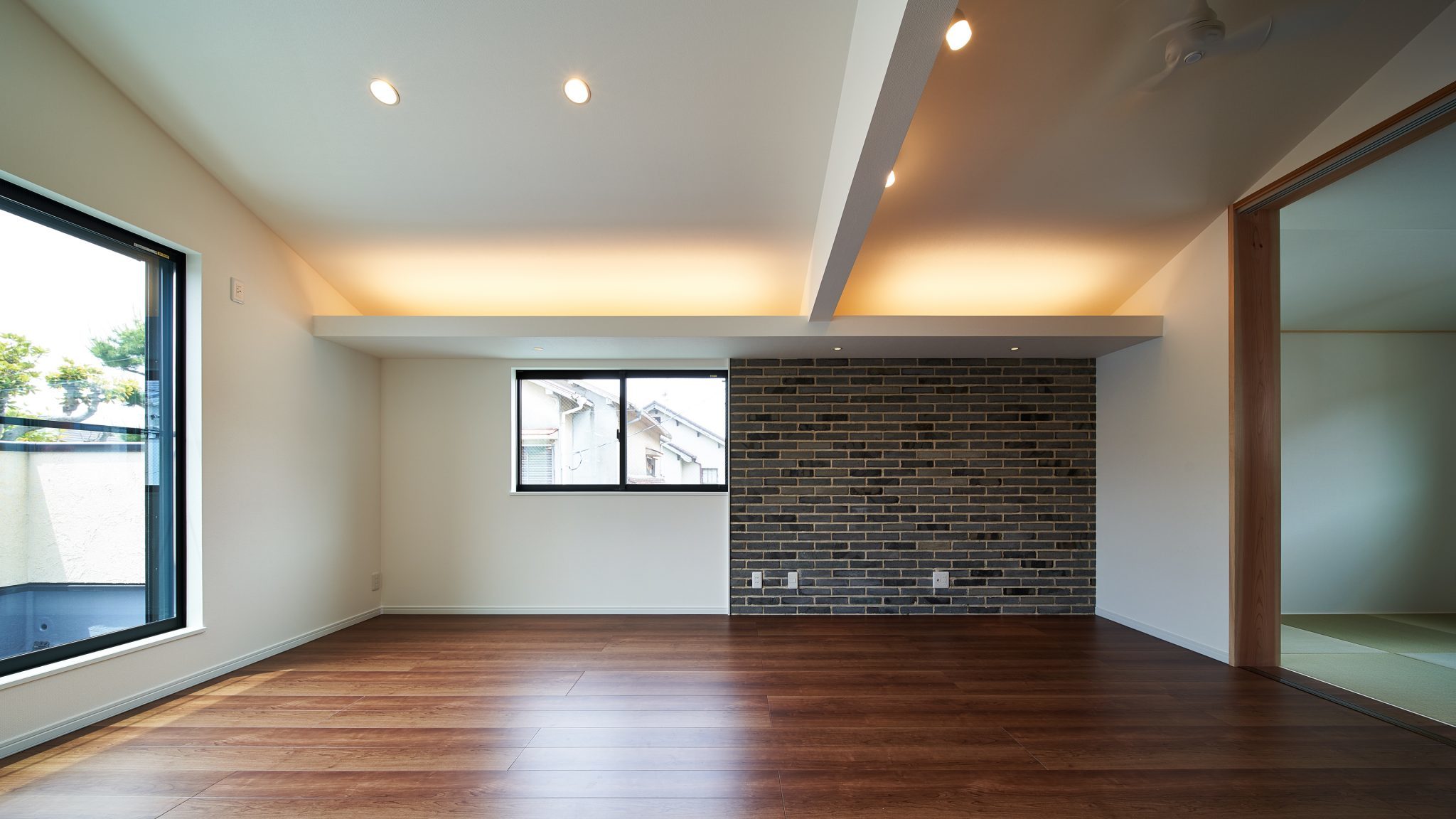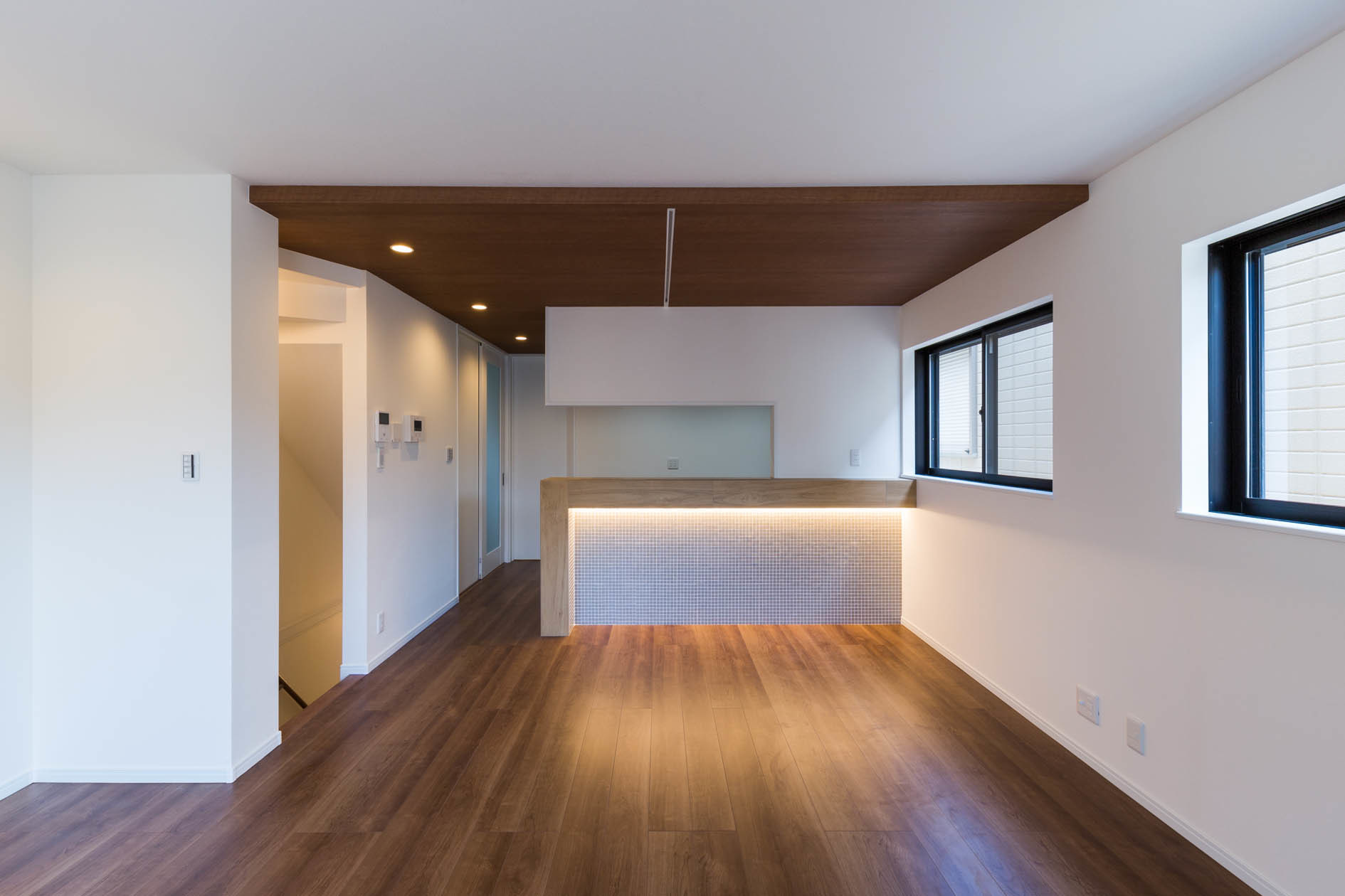 桁落ちしてしまう場所は、間接照明などで低さを感じさせないデザインとし、そのまま勾配成りに天井を上げて、広がりを感じさせるように工夫した。