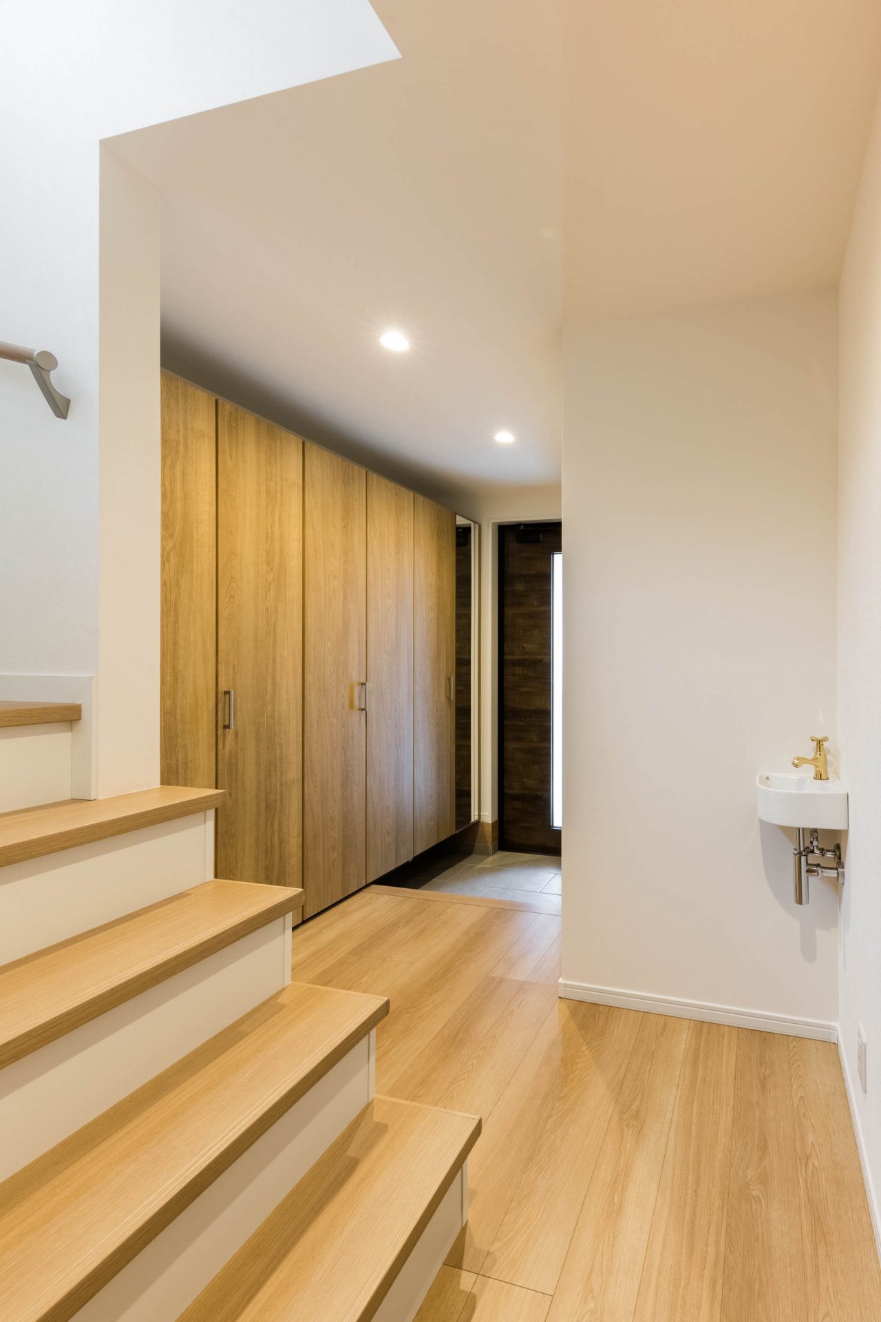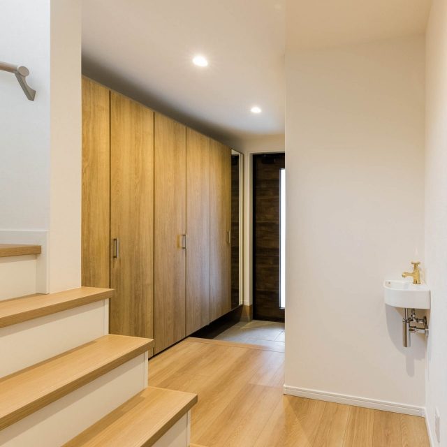 玄関入ってすぐに、手が洗えるコンパクトな手洗い器。