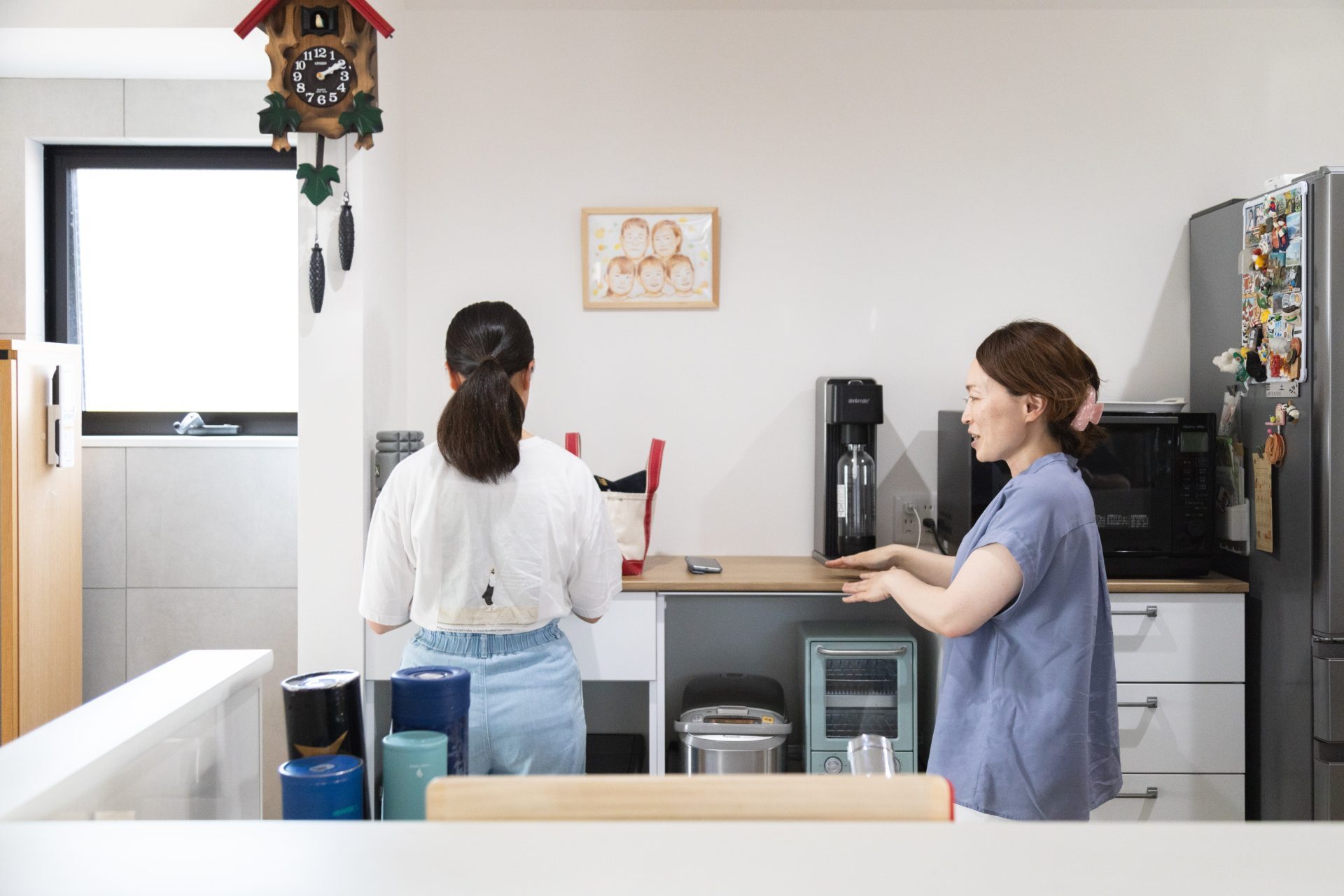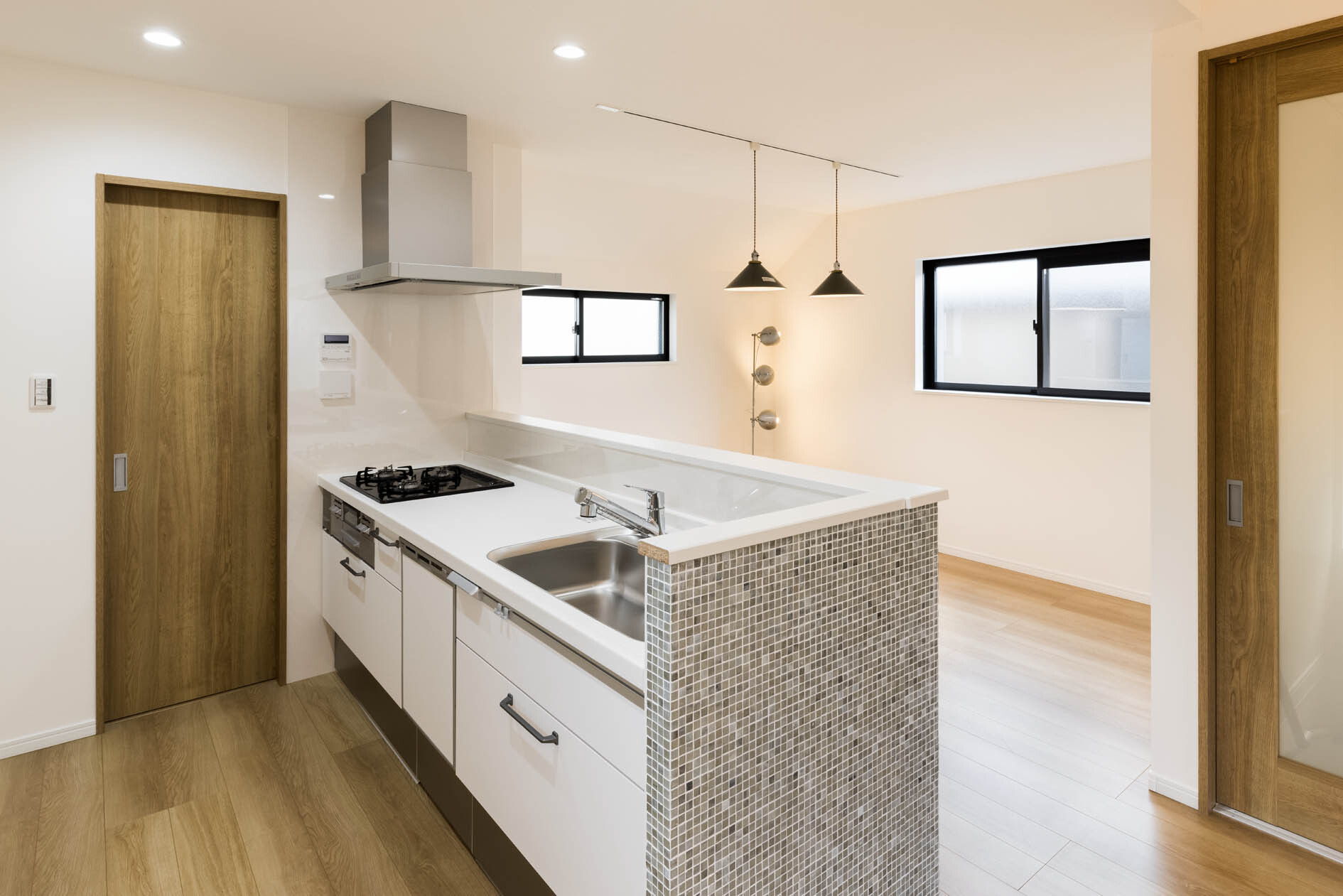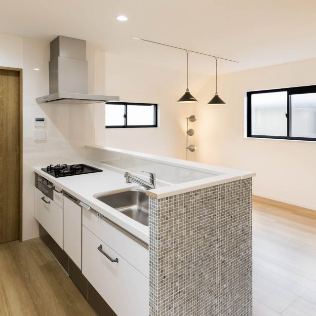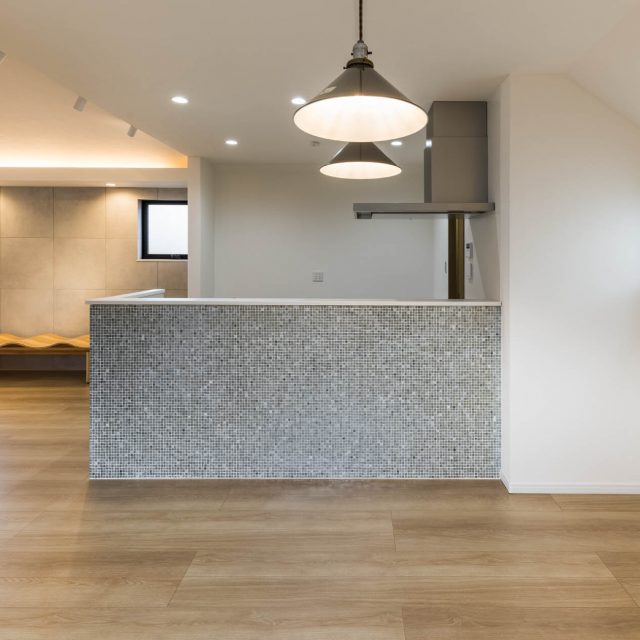 キッチンは、フルフラットも可能でしたが、使いやすさを重視して、手元が隠れる設計に。