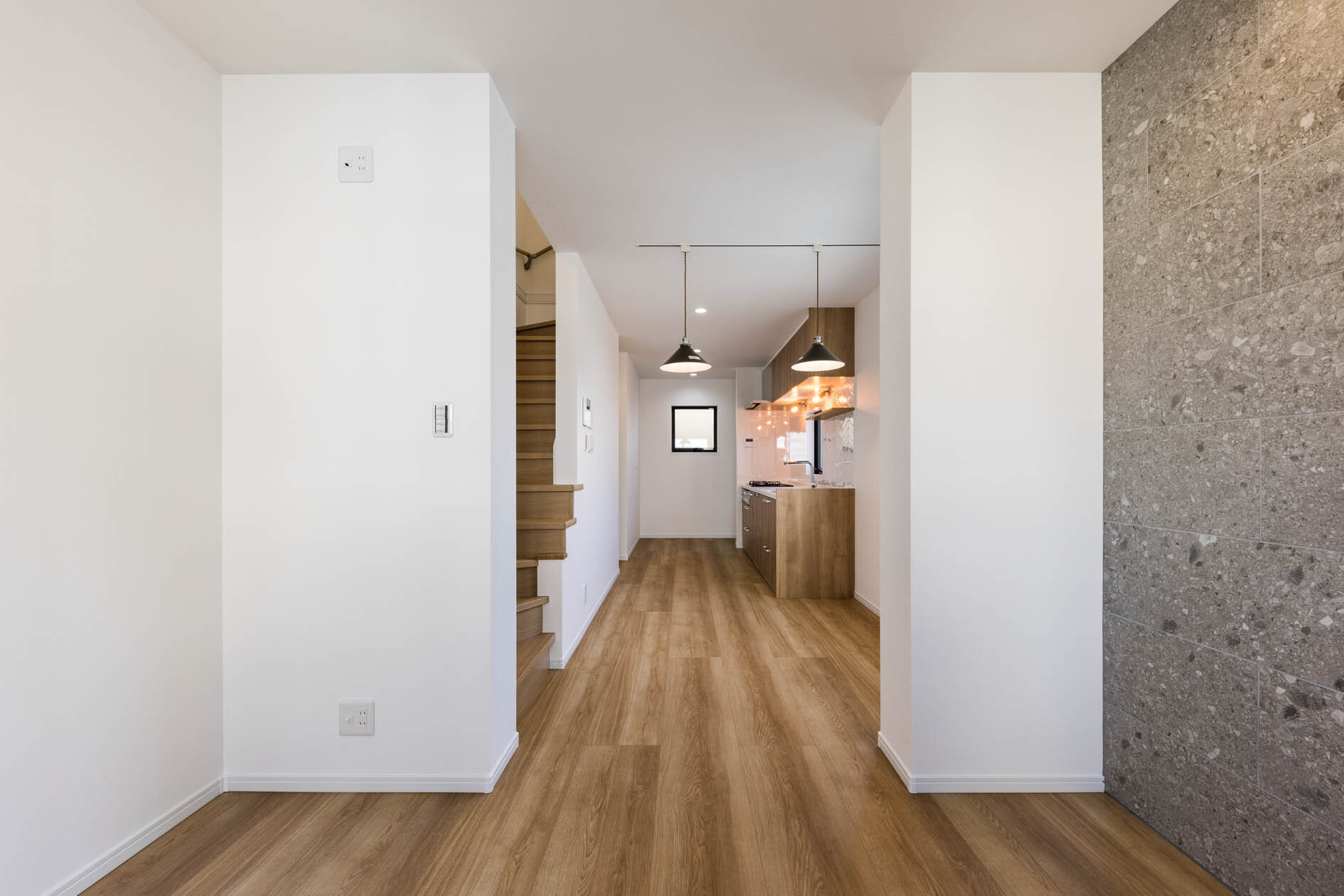 長辺間口に玄関を取り、廊下と玄関ホールを一体に使えるようにした。