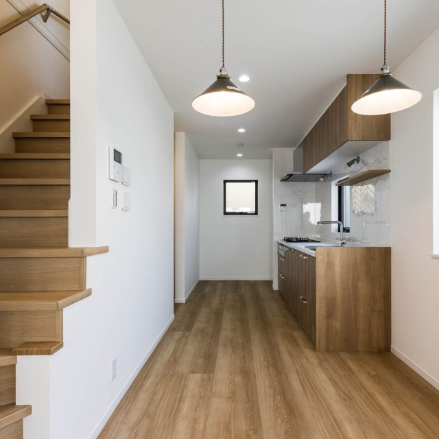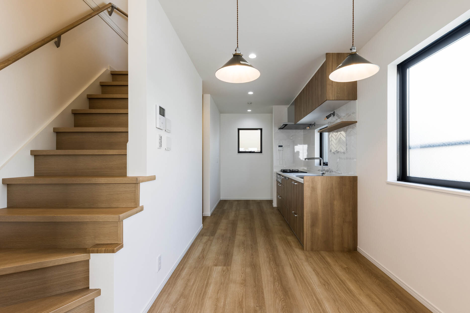 階段室は、1階の玄関前も2階のダイニング部分もひな壇にして開放感を出し、視覚で広さを取り込めるようにしました。