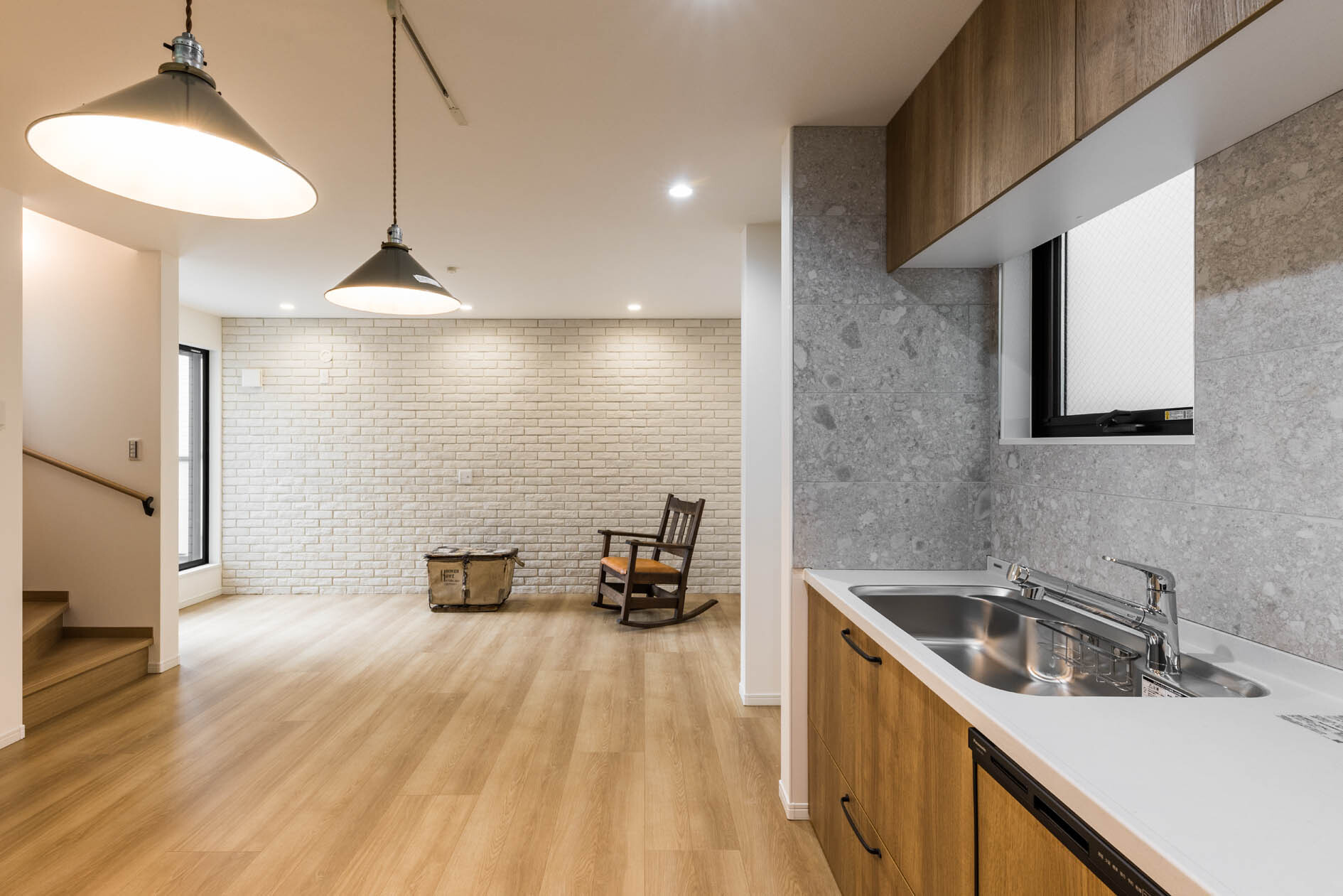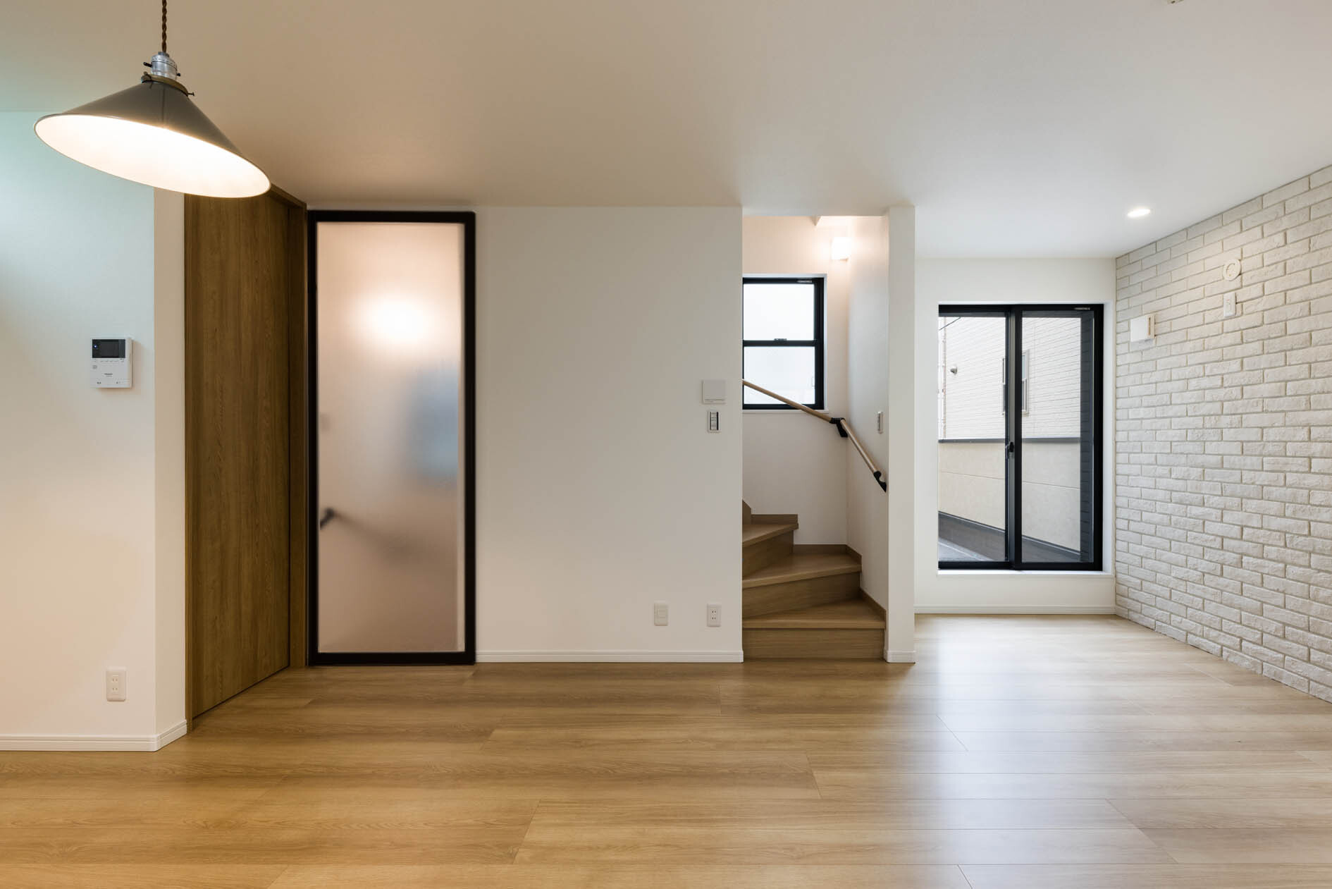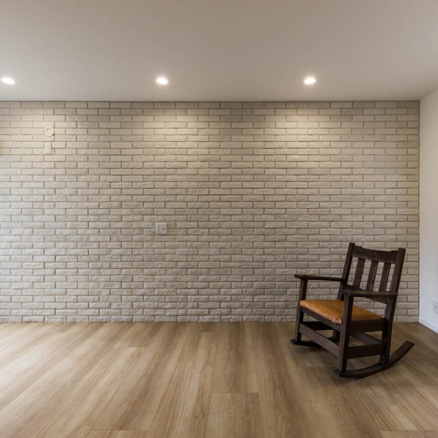 リビングの大きな面には、白レンガタイルで圧迫感を出さずにアクセントを。