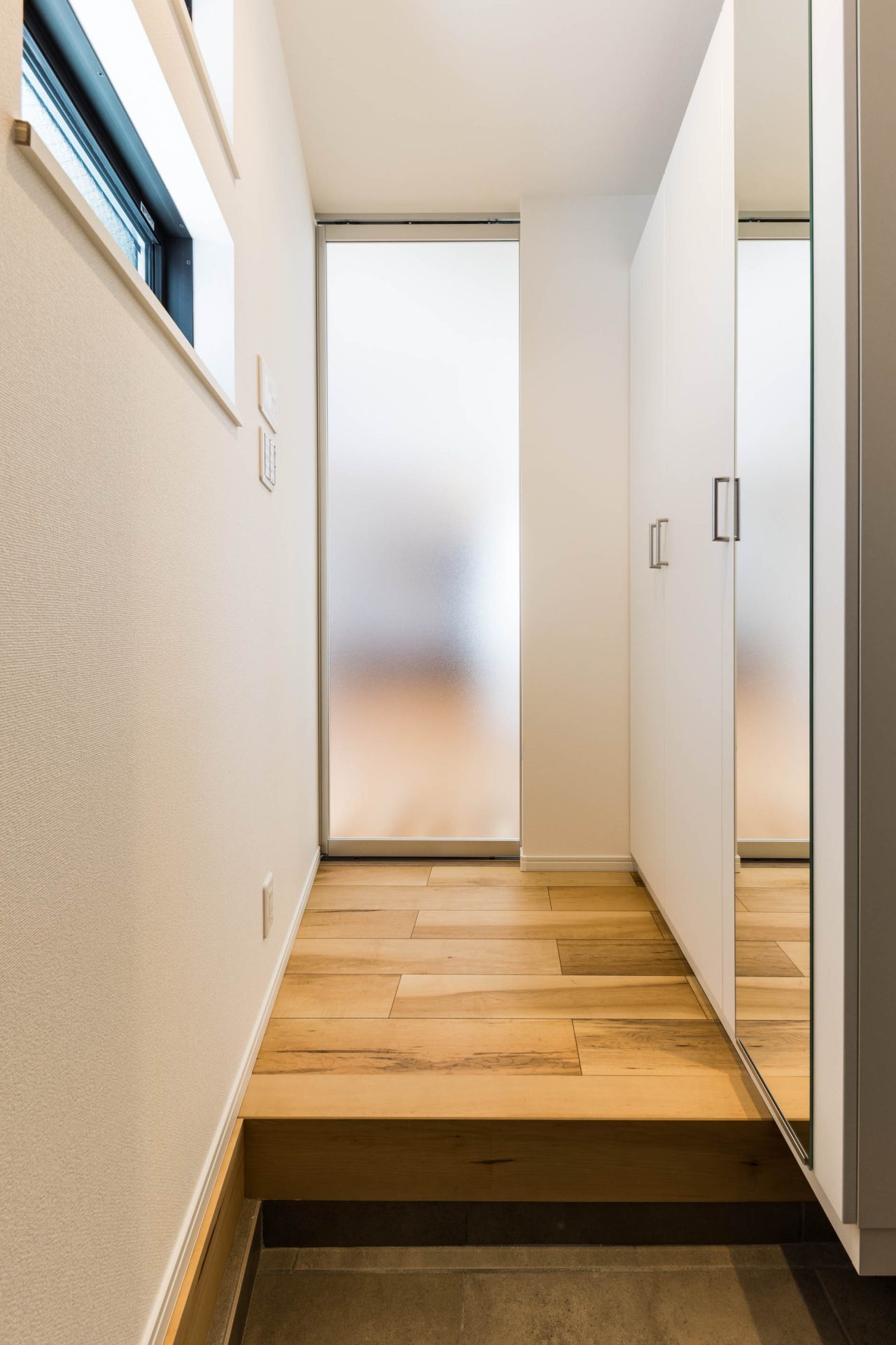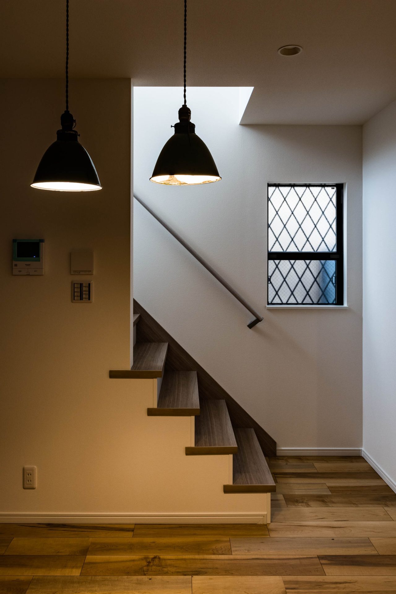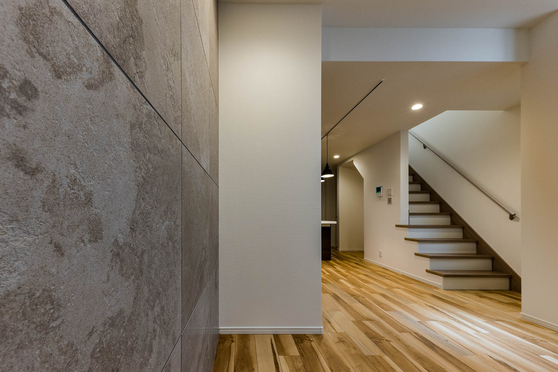 玄関ホールを斜めにすることで、駐車と玄関ホールの両立を考えた。