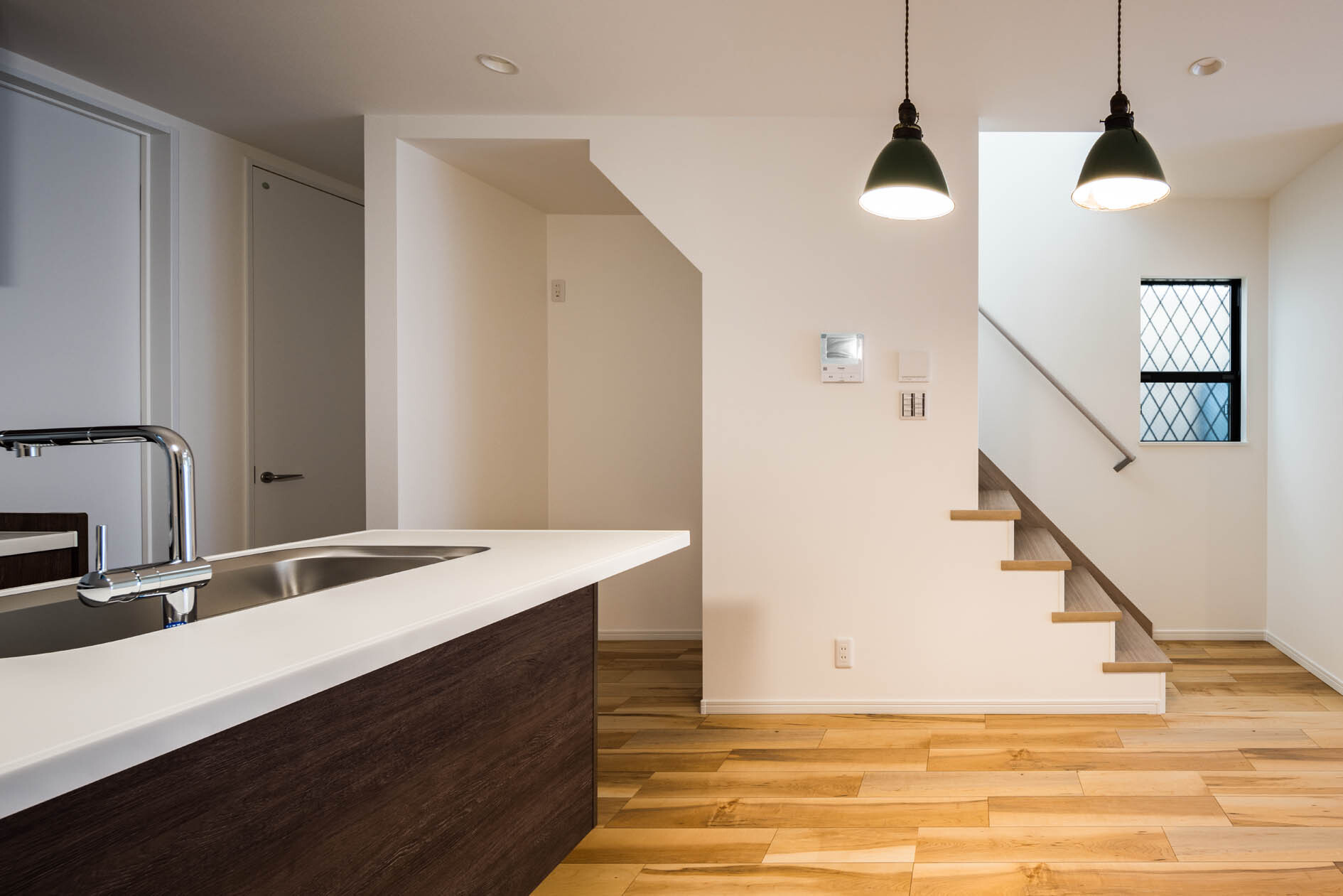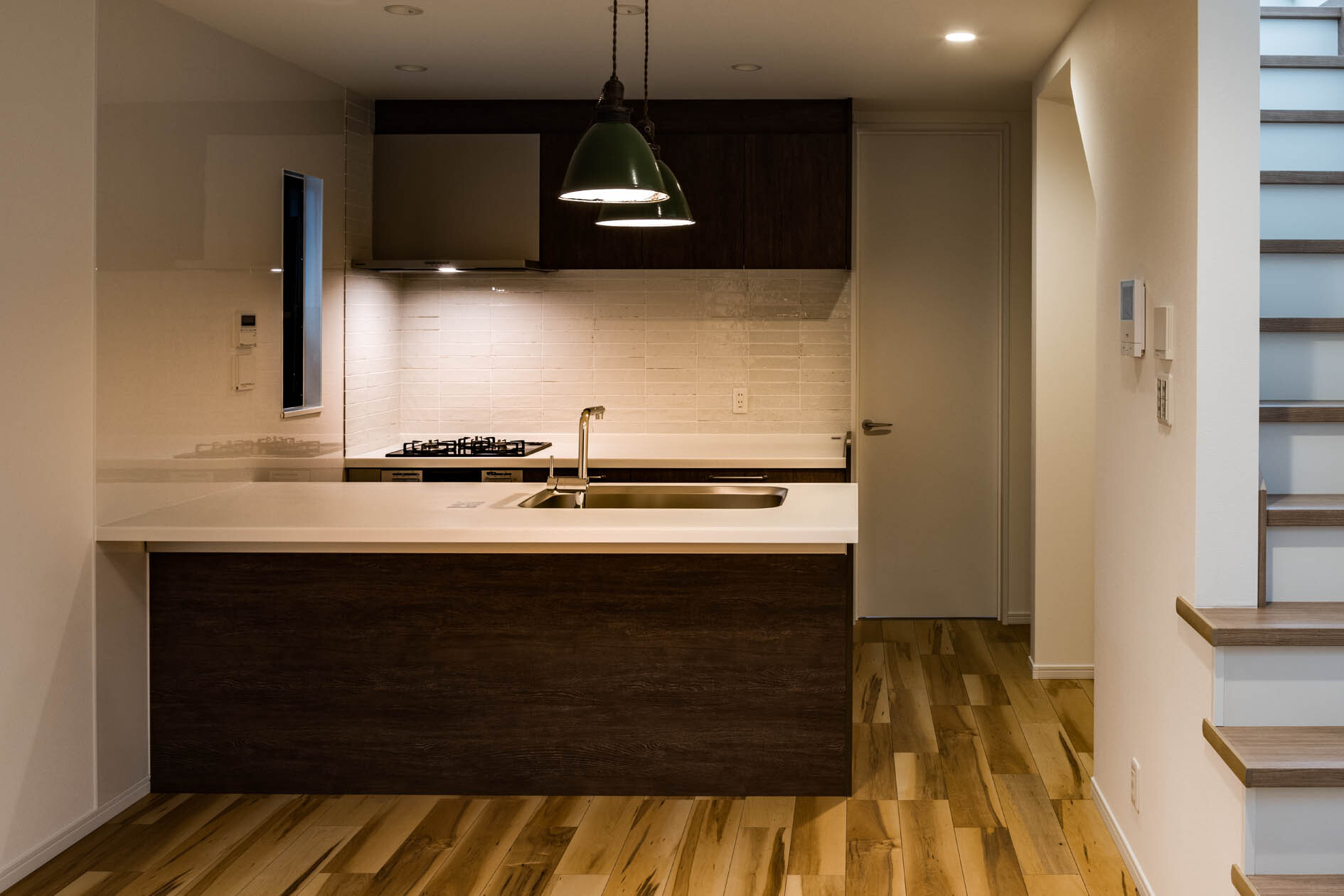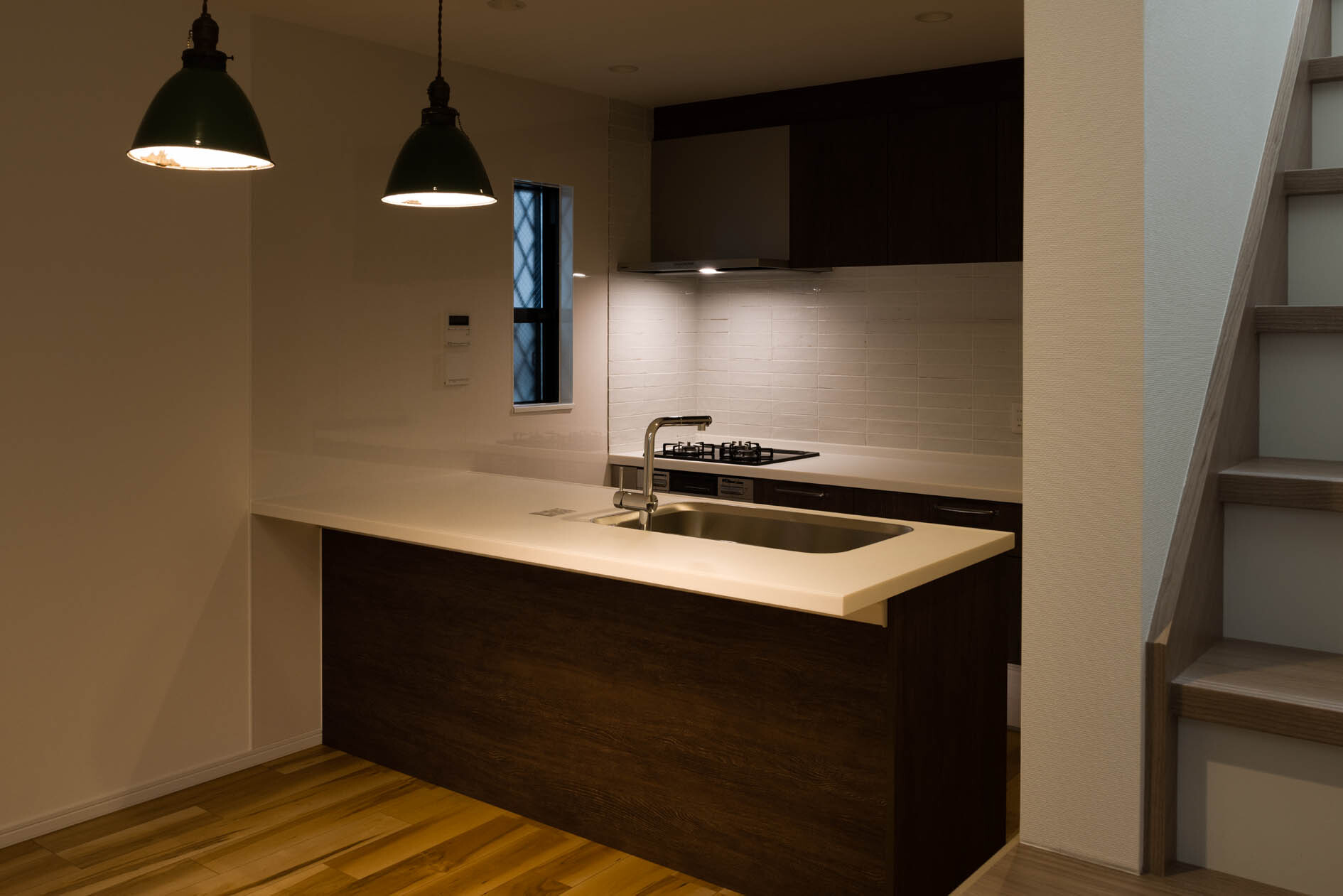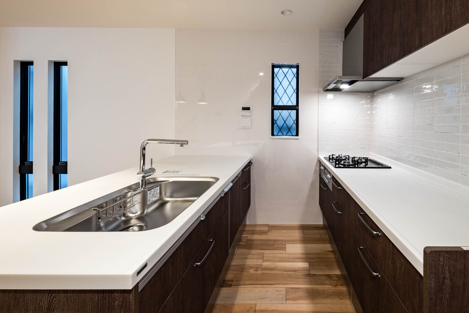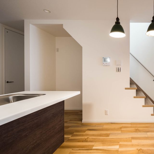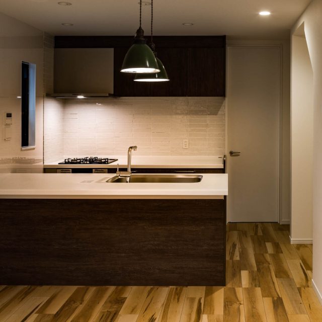 キッチンを2型にすることで、キッチンの幅と導線を確保した。