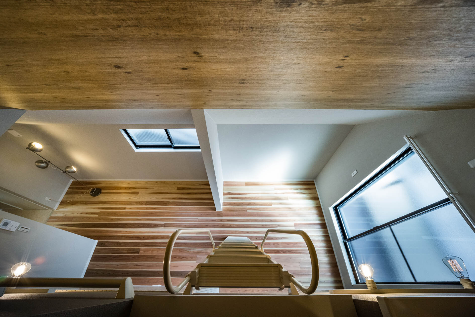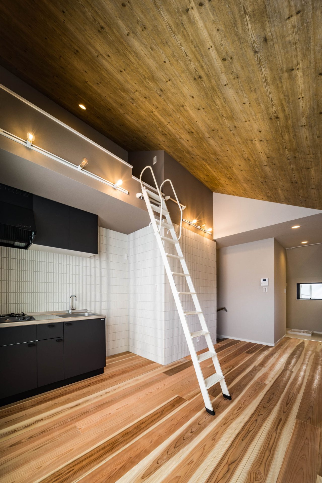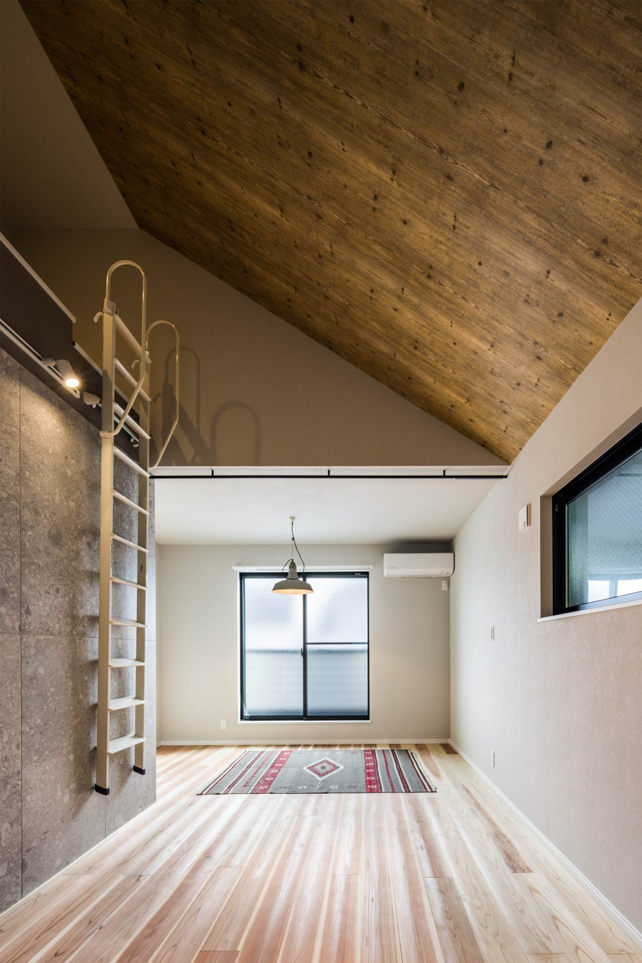 桁落ちから延びる天井は、そのまま勾配なりに高天井に。