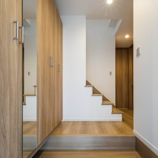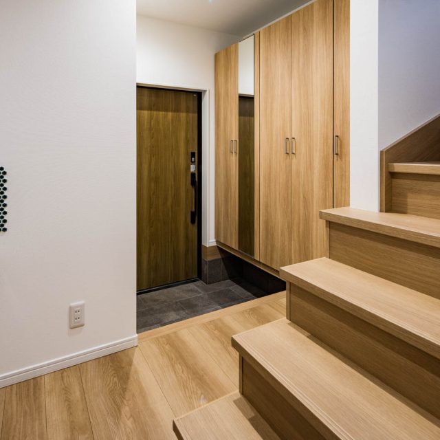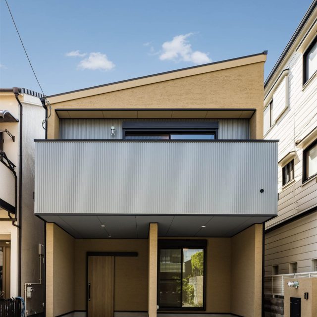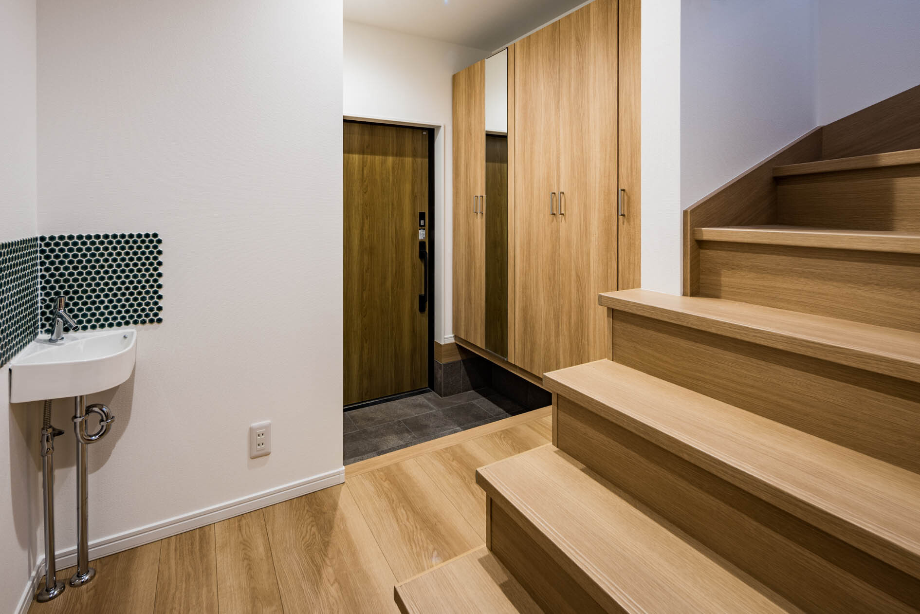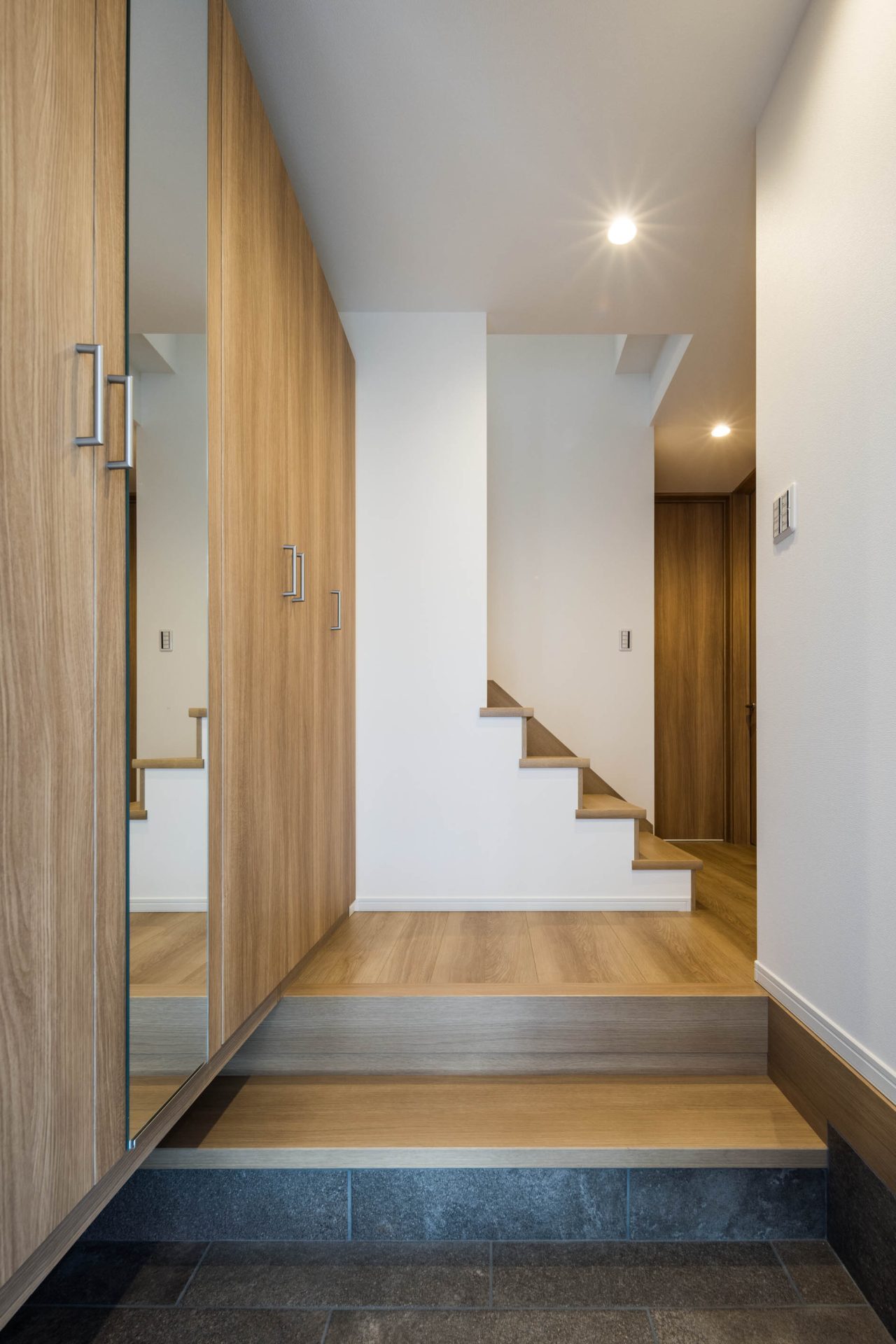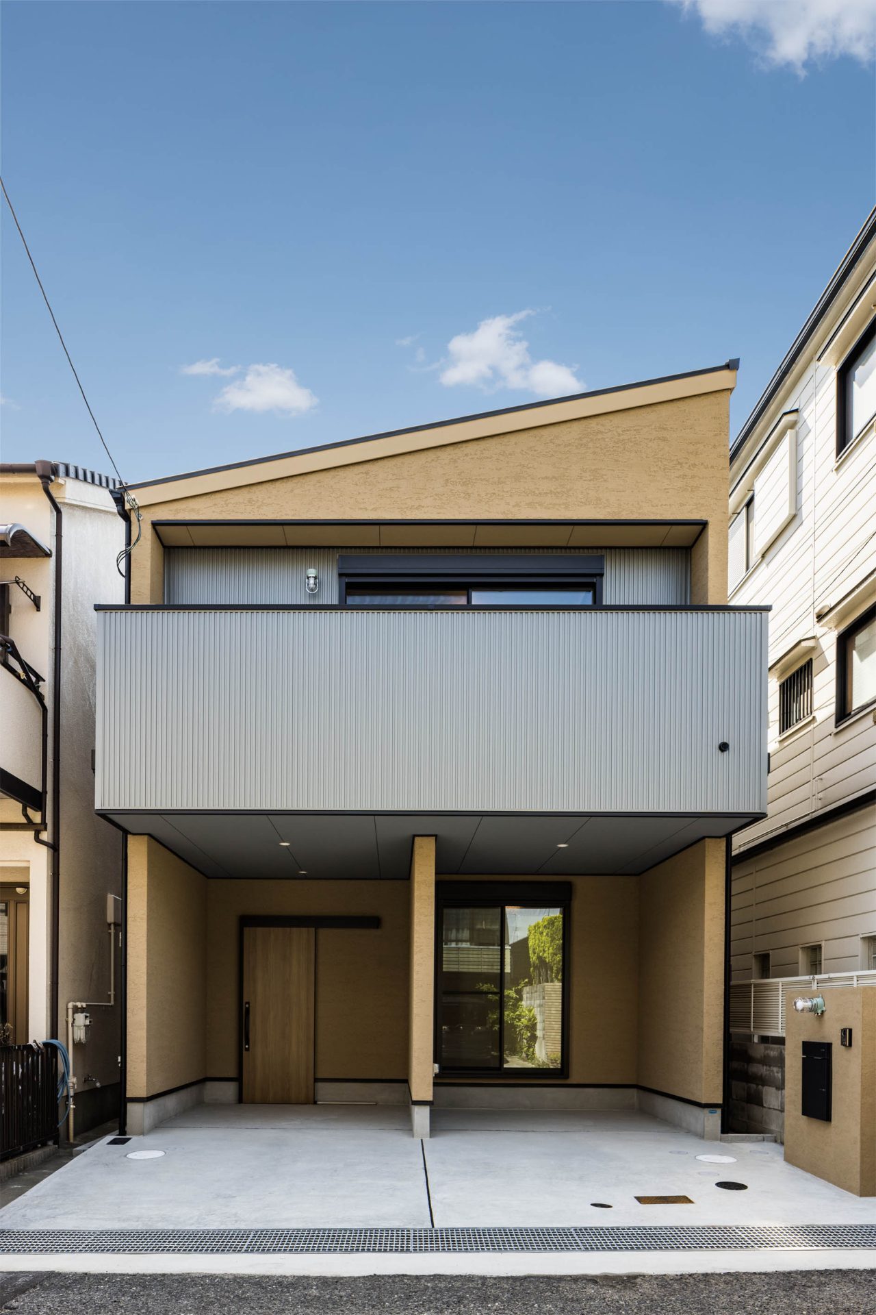 玄関ドアを引き戸にすることで、ファミリーカーを停めても開閉に支障がないようにした。