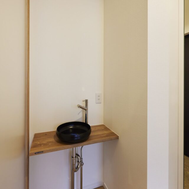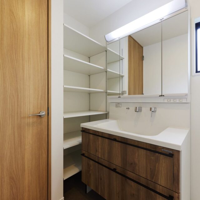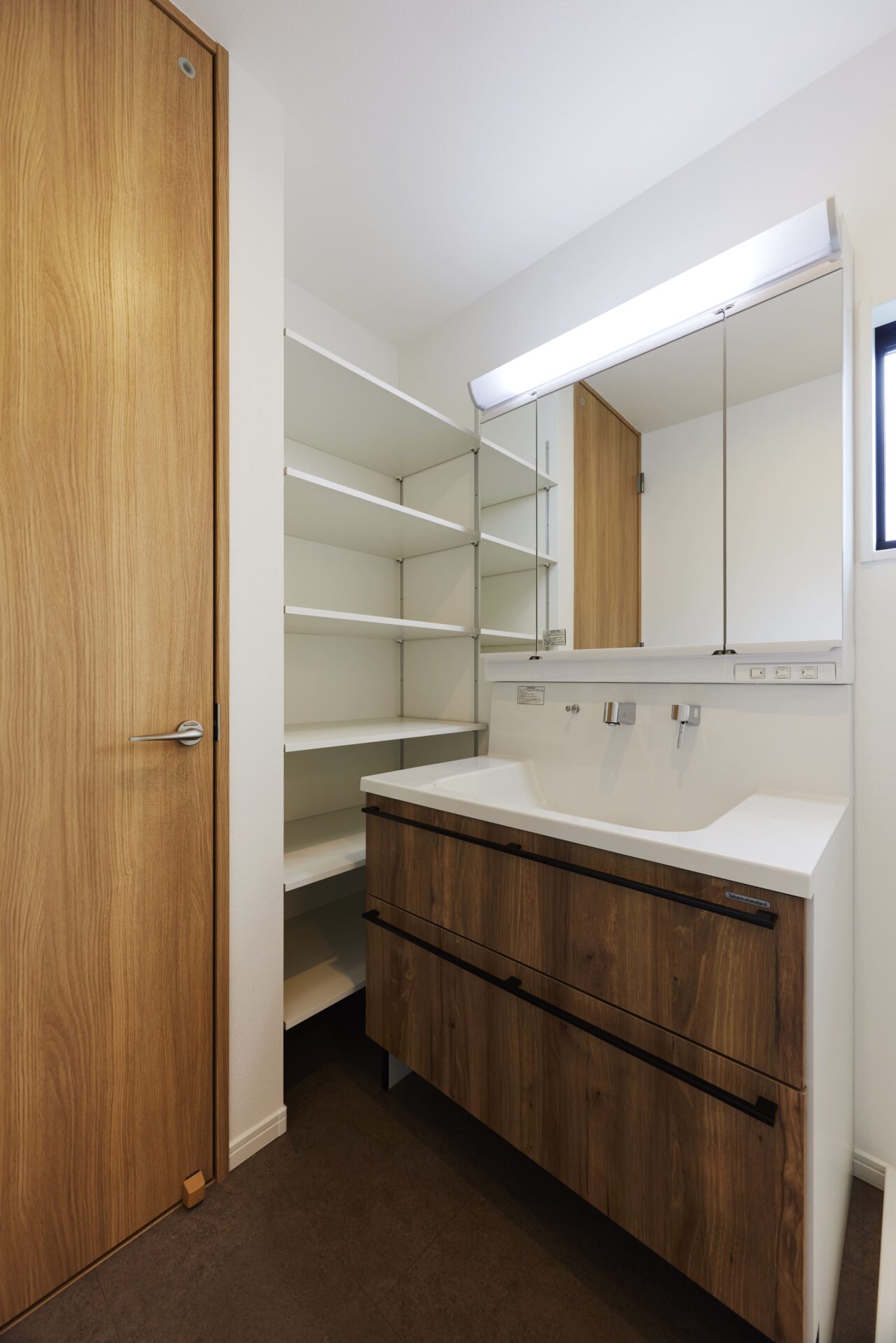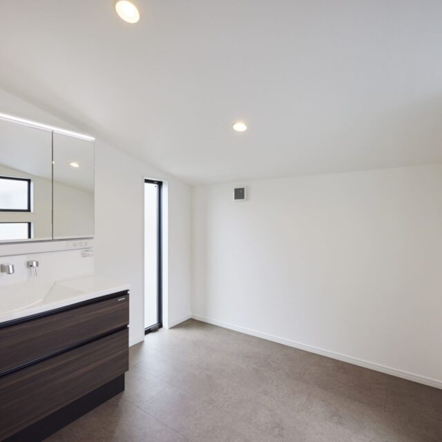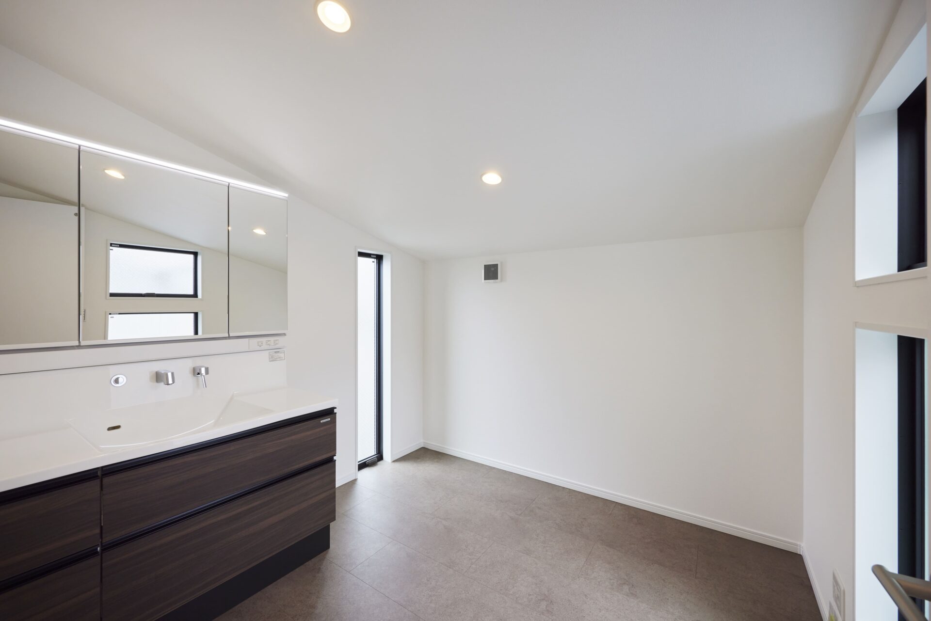 A号地は、2階にLDKを持ってきたパターン。勾配天井を設け、広がりを持たせています。広い洗面室は、家事室にも。