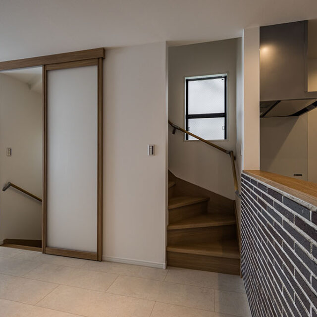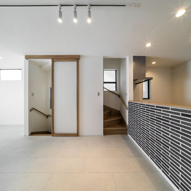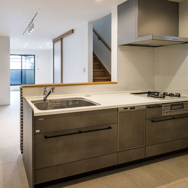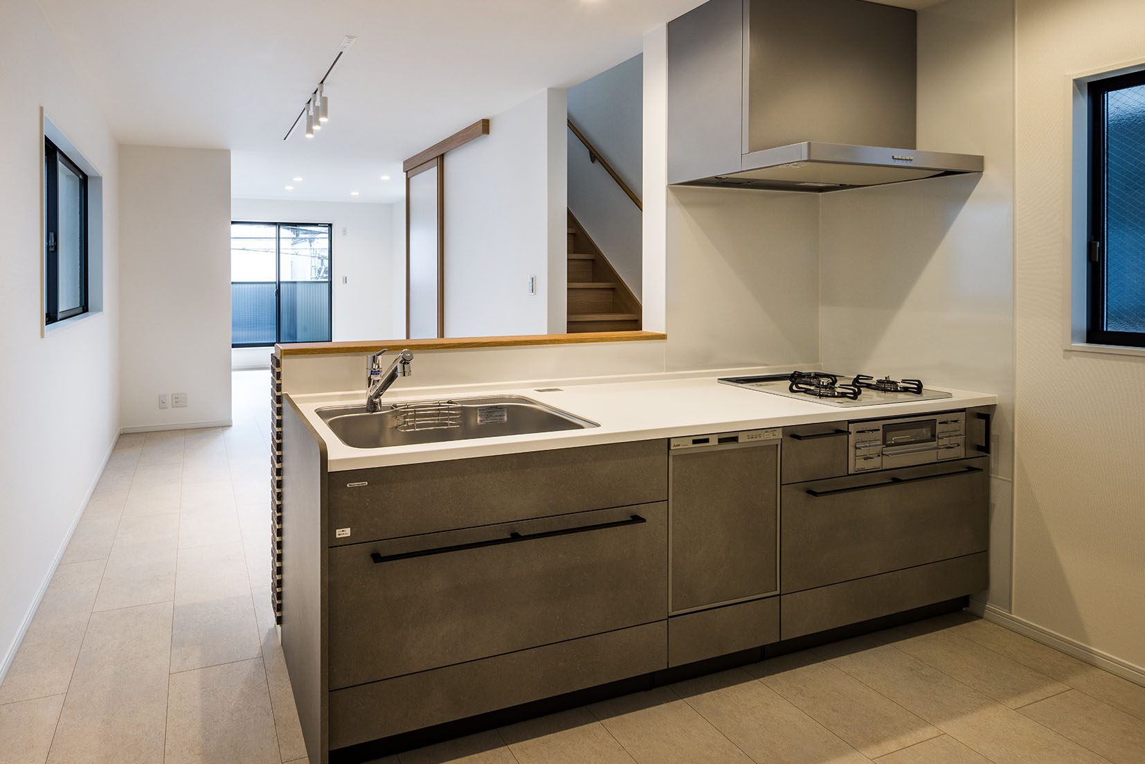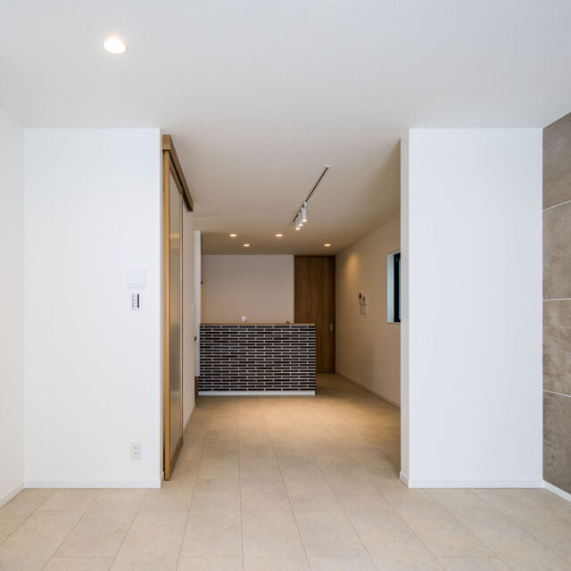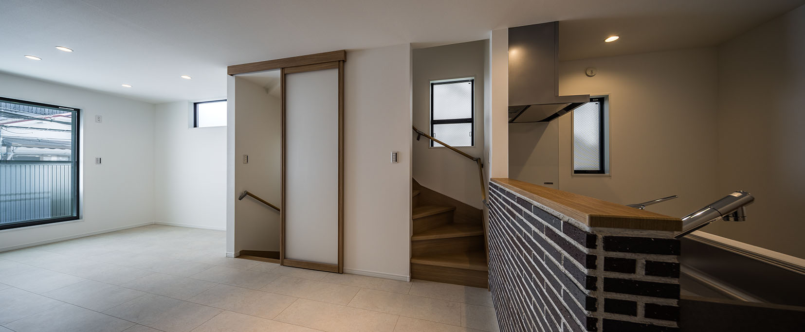 水廻りは、LDKから直接出入りすることで通路を減らし、間口をそのままLDKに使えるようにした。