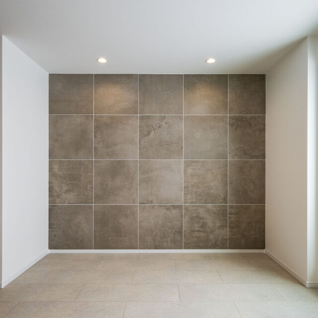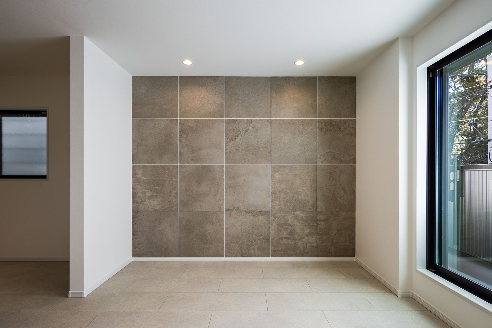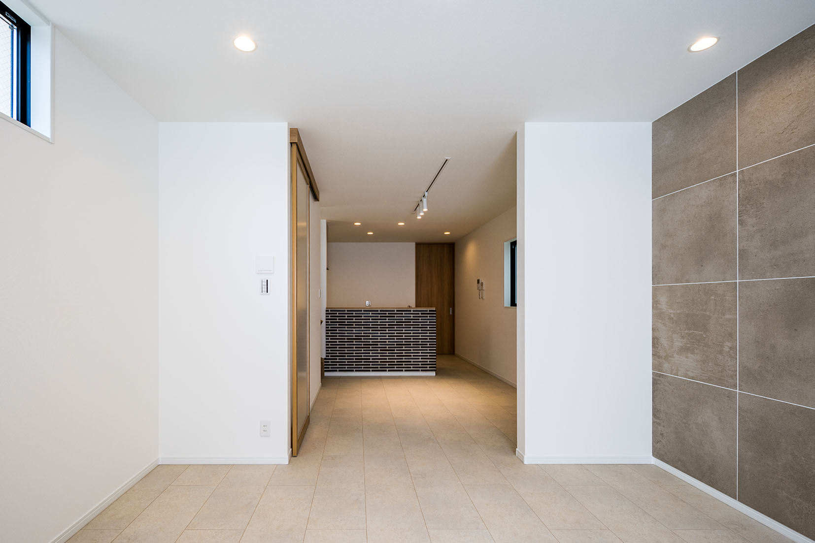 石目を効かせた明るい床材にモルタルのようなグレーのリビングタイルと