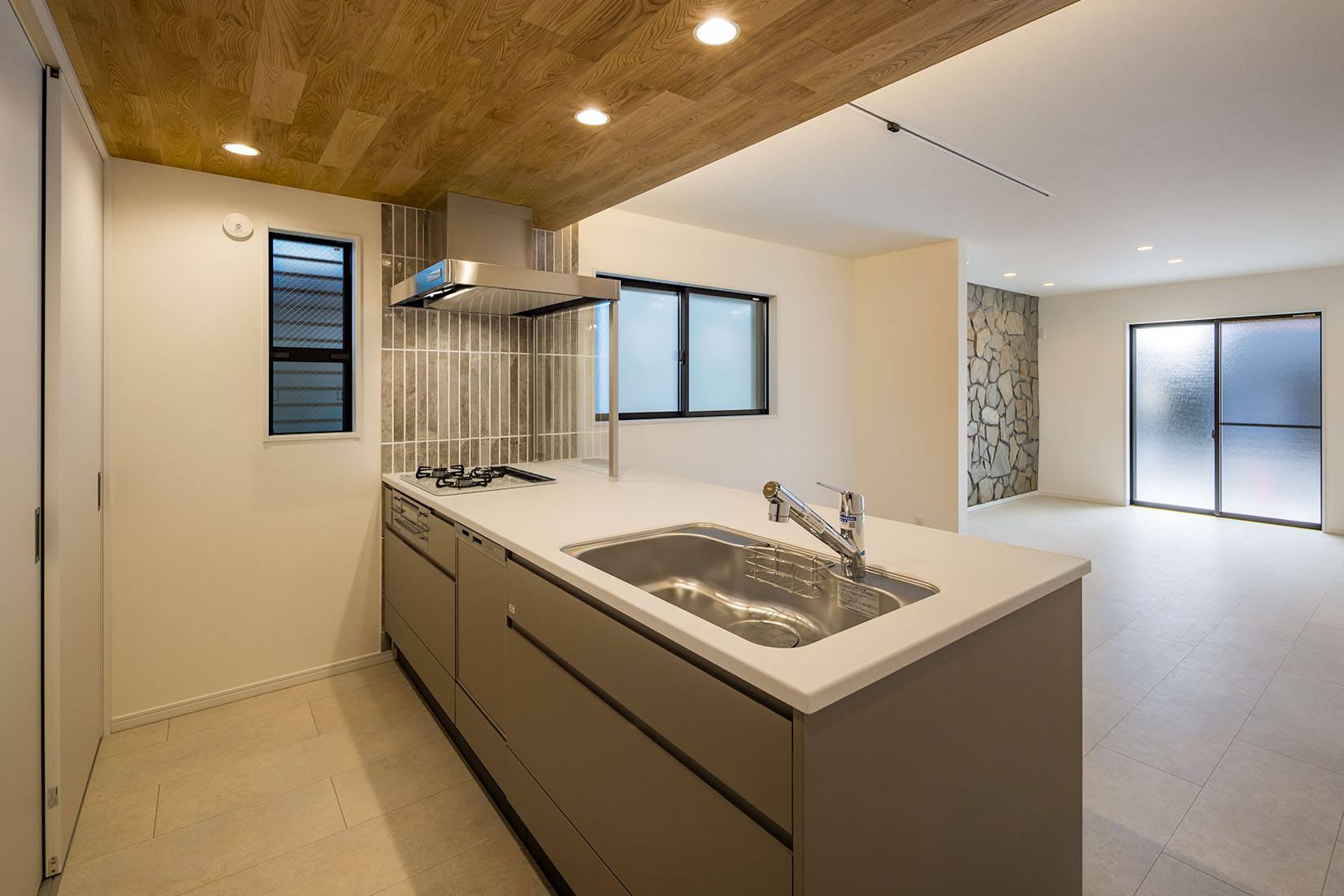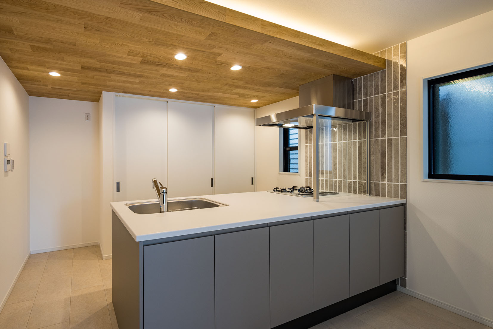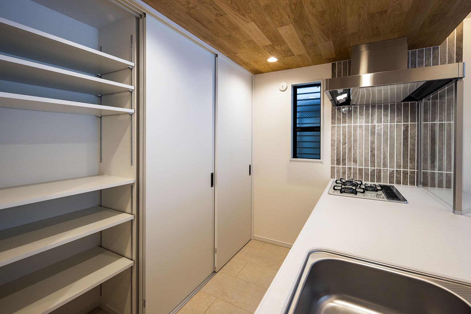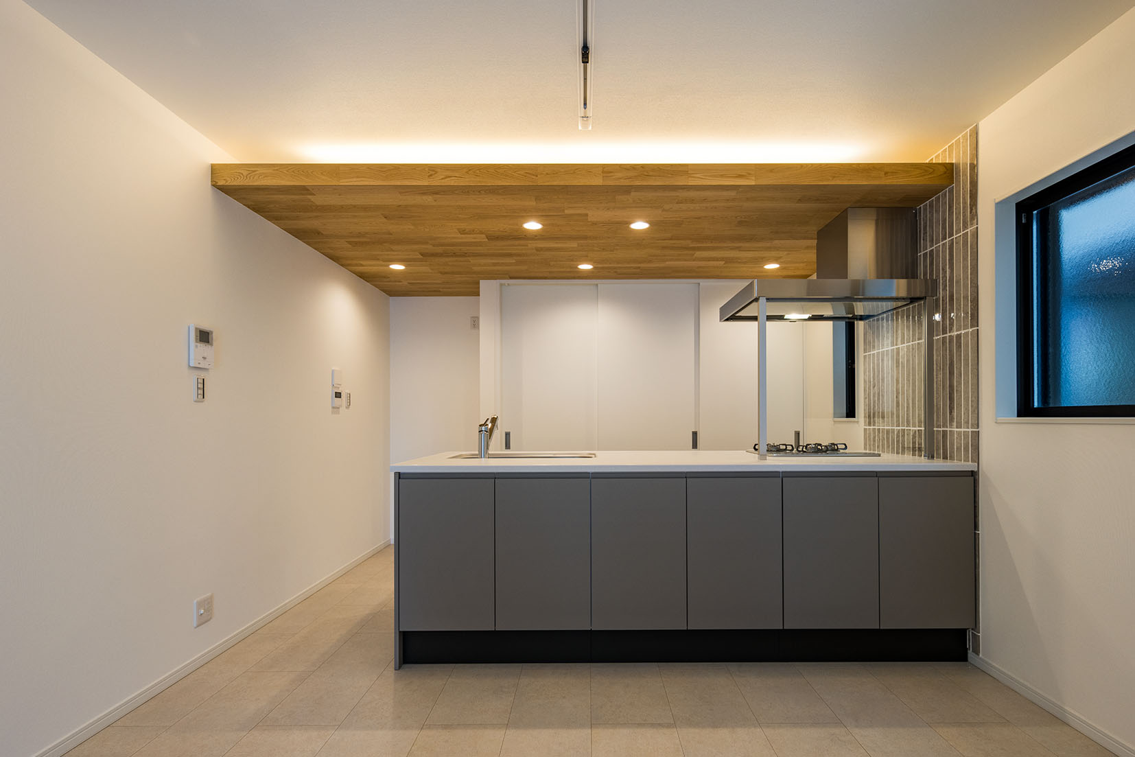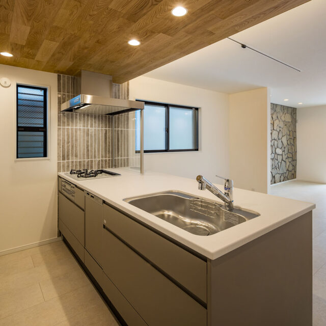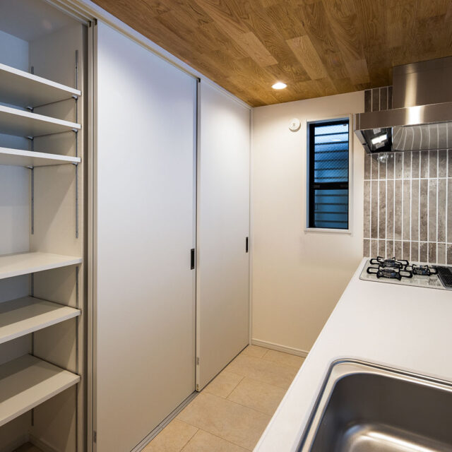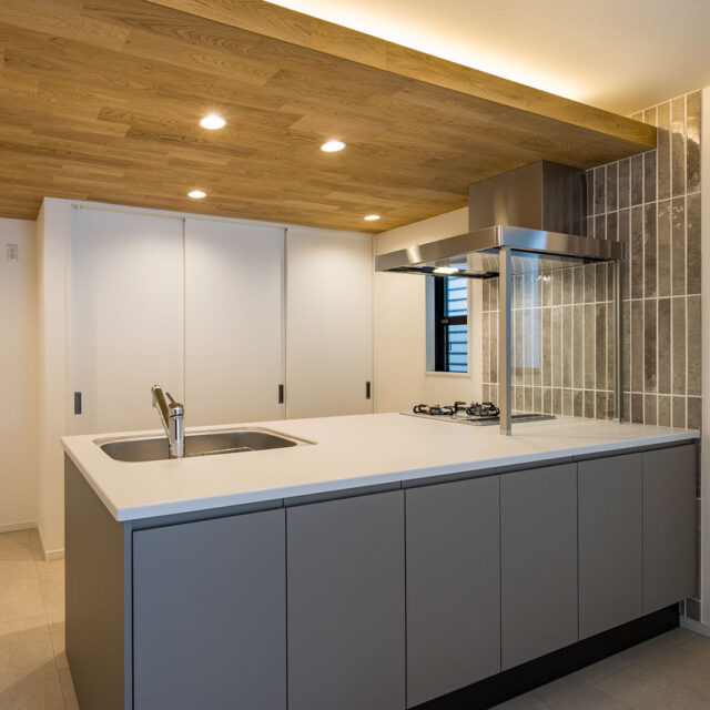 キッチン上部には、耐火性能のある無垢板を貼り、