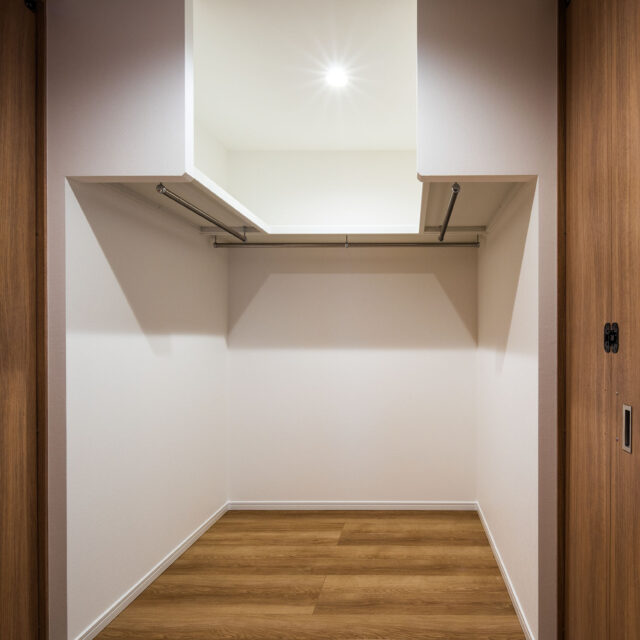 2階のファミリークローゼットは2つの部屋の収納を兼ねることで、通路を減らし居室の広さも確保することができた。