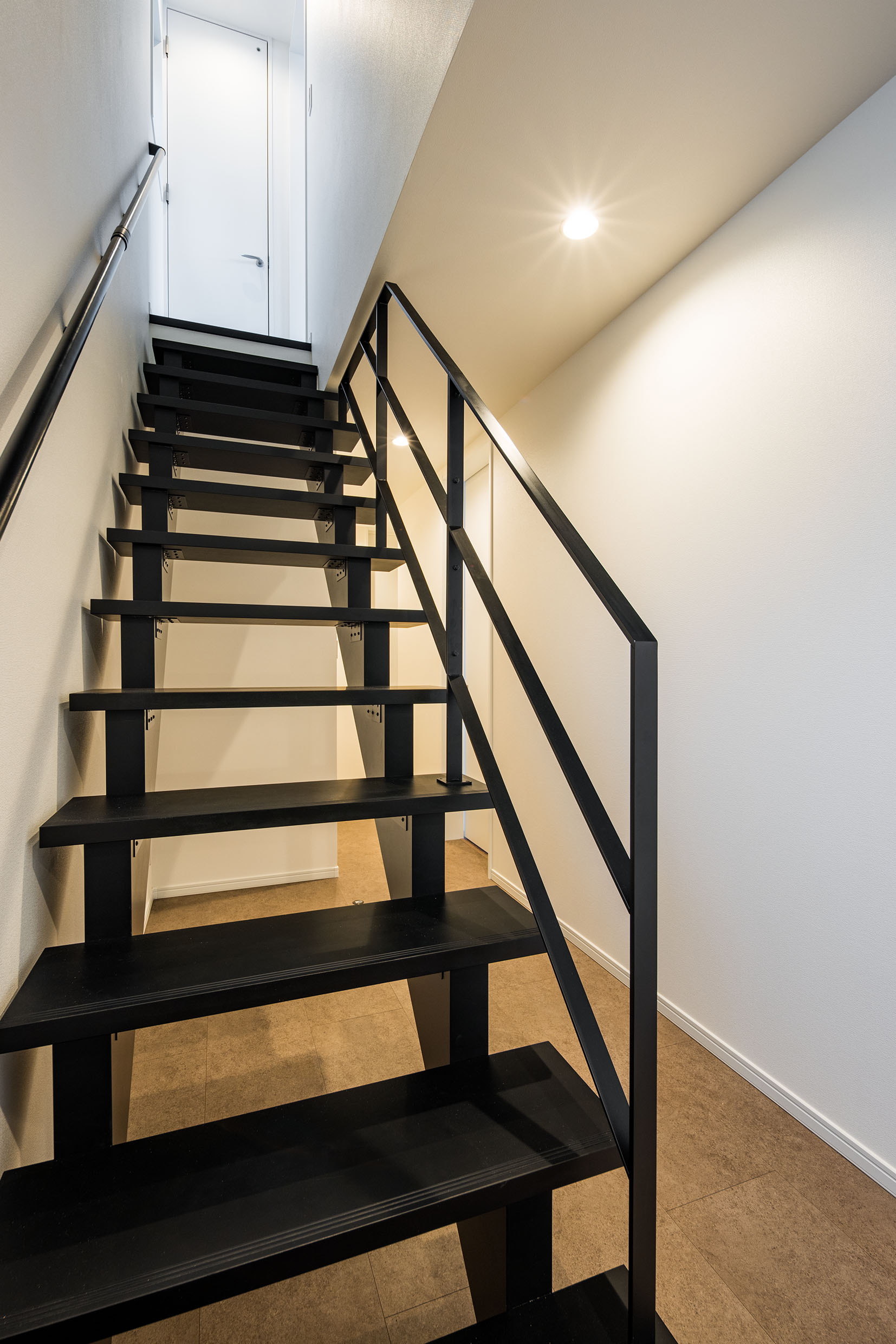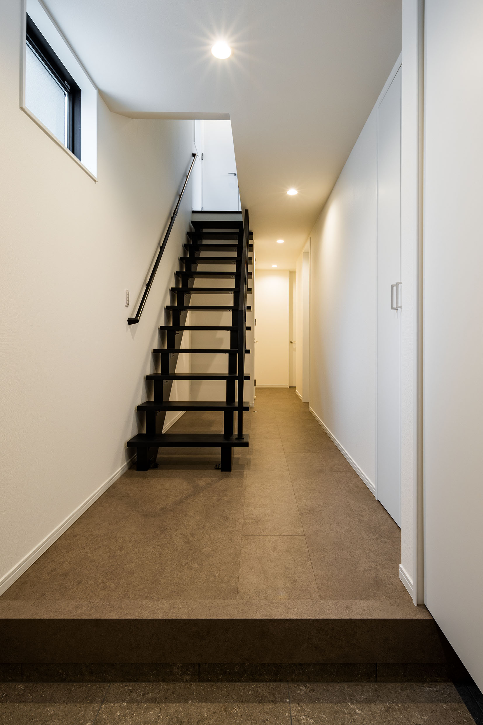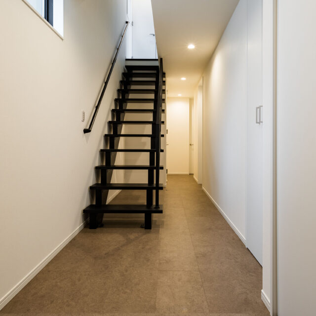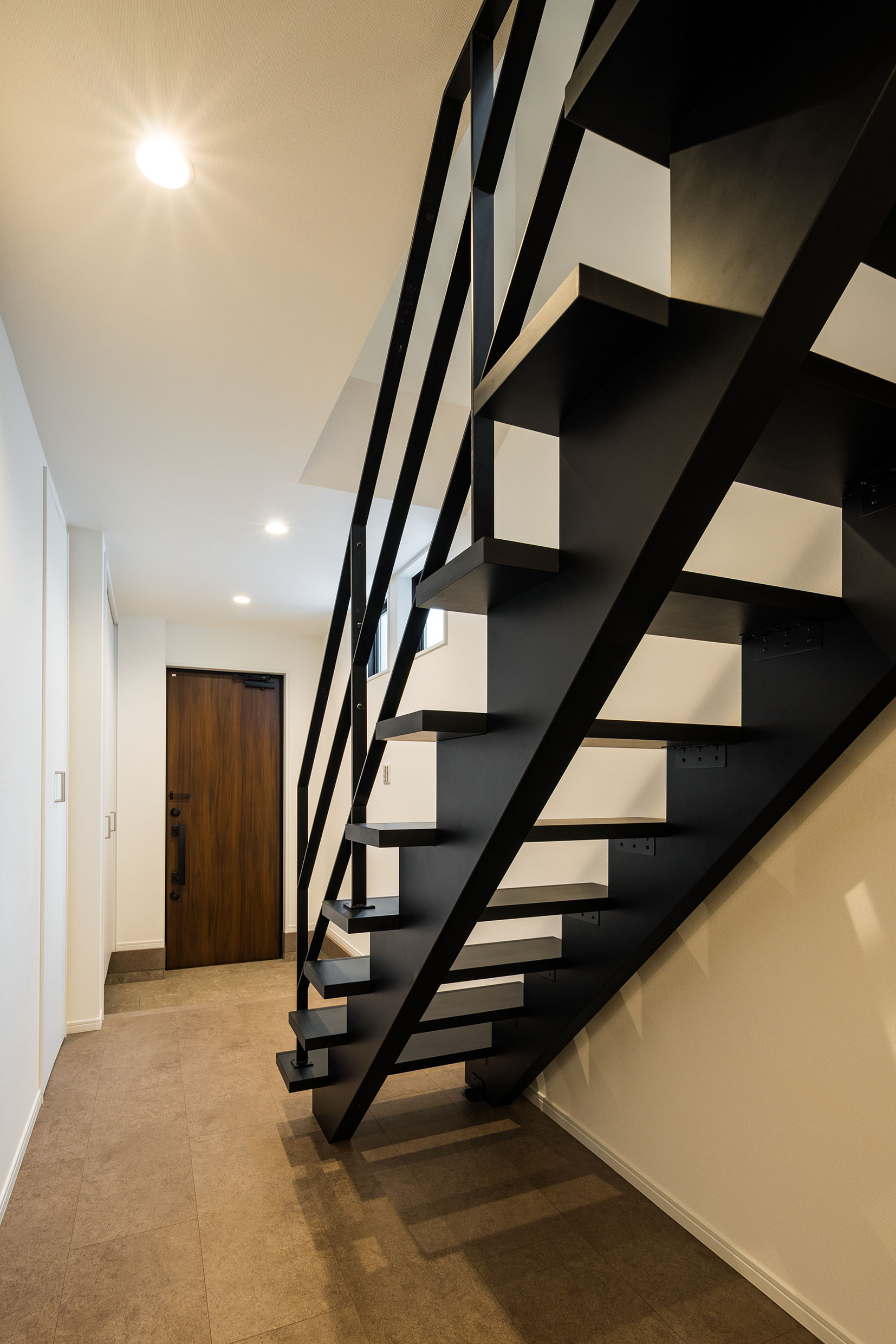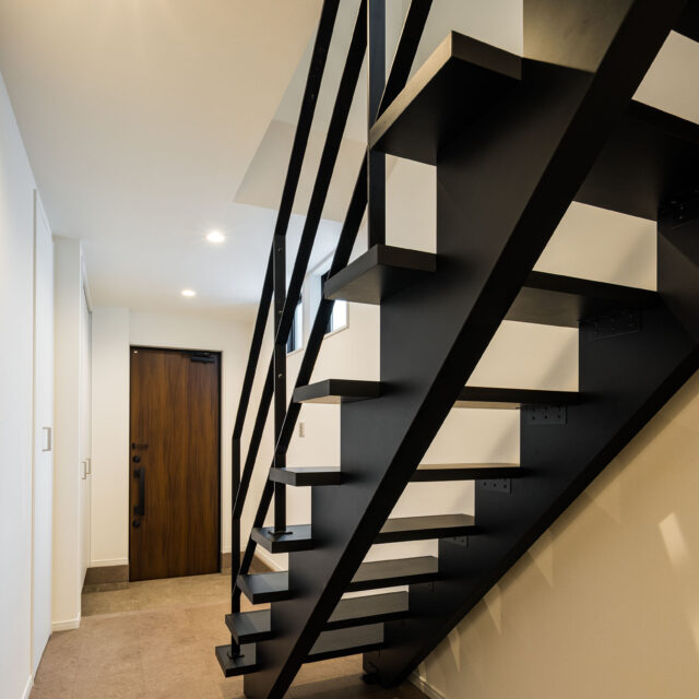 玄関から見えるストリップ階段が目を惹きます。