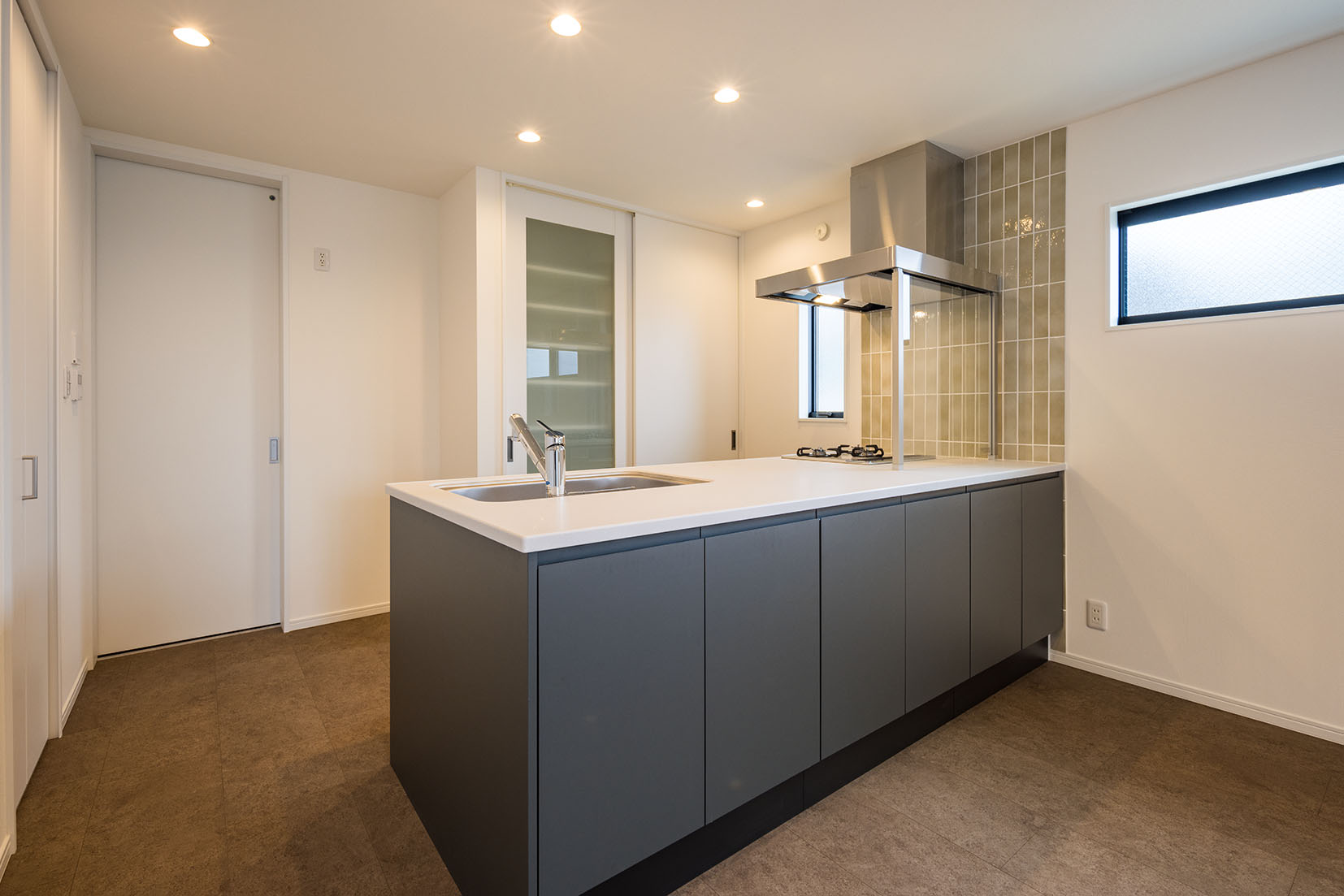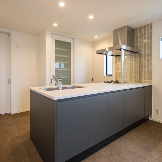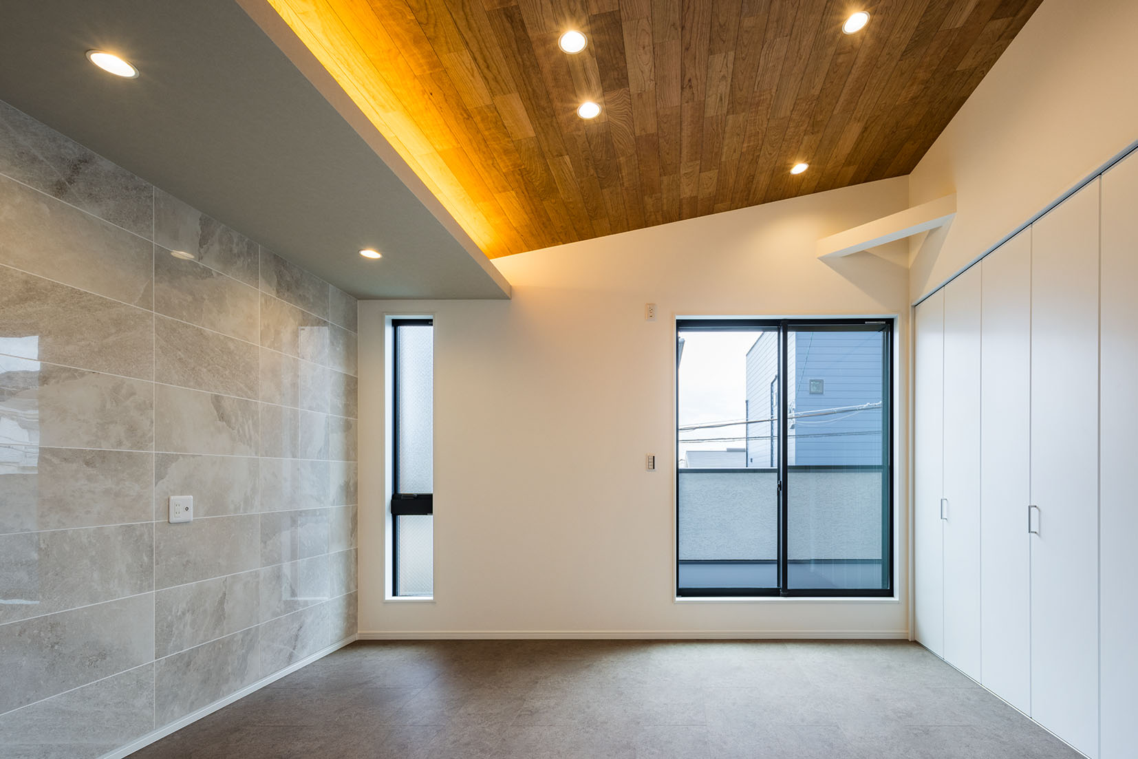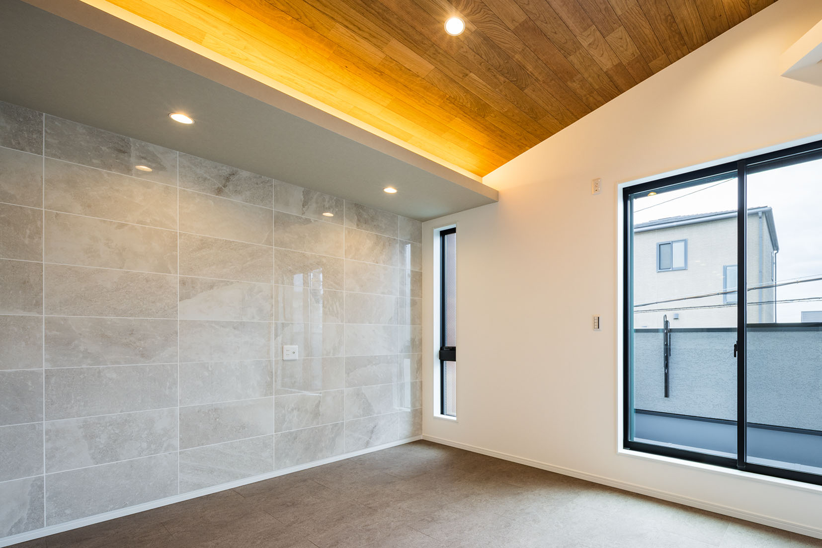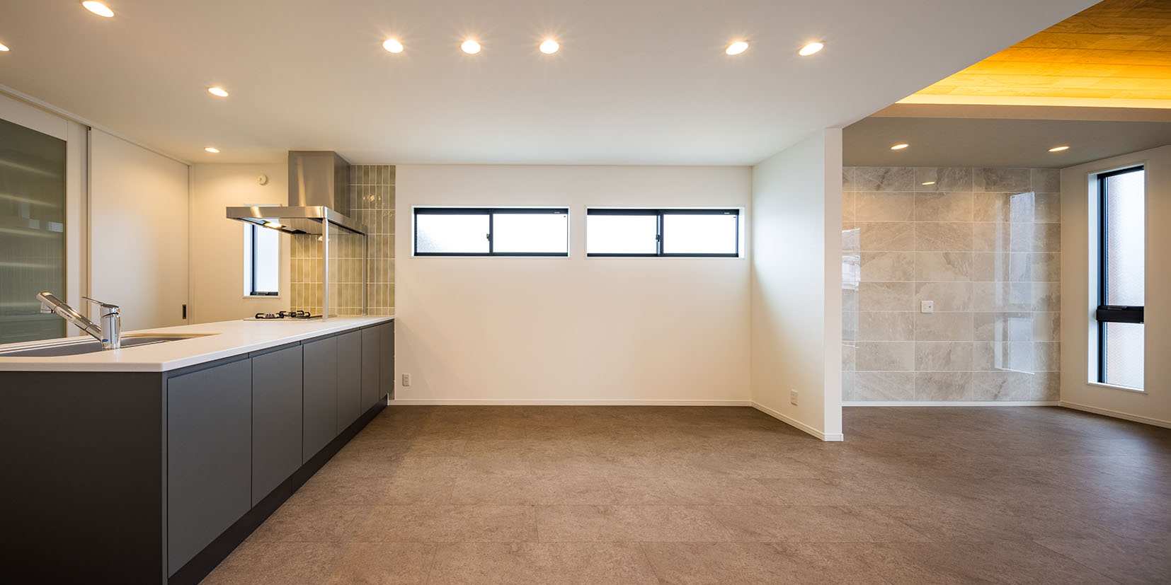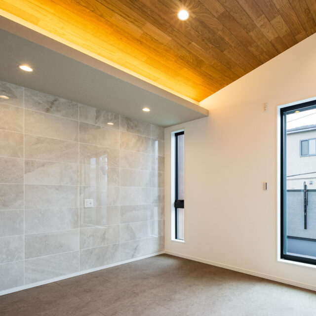 フラットで艶の美しいタイルと板張り天井で仕上げました。