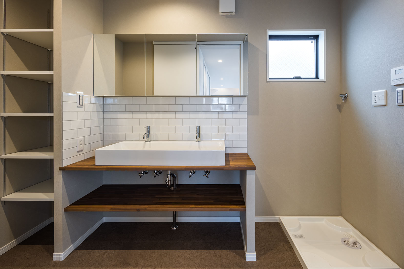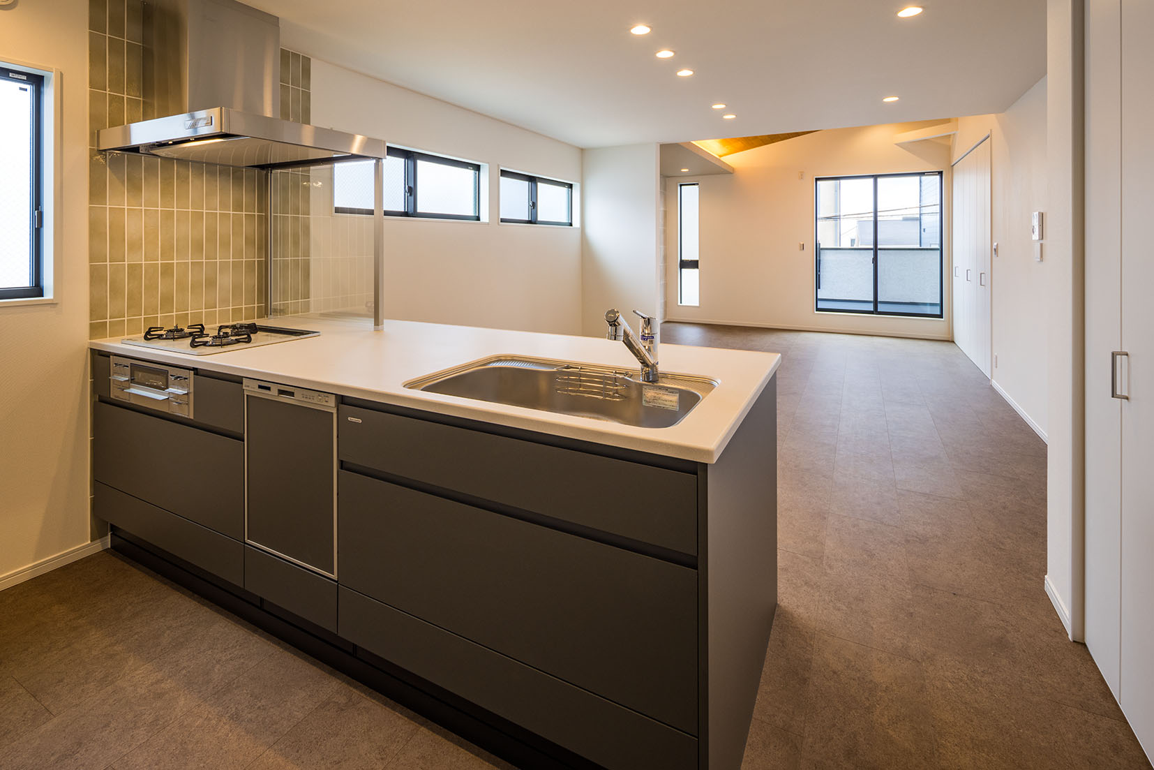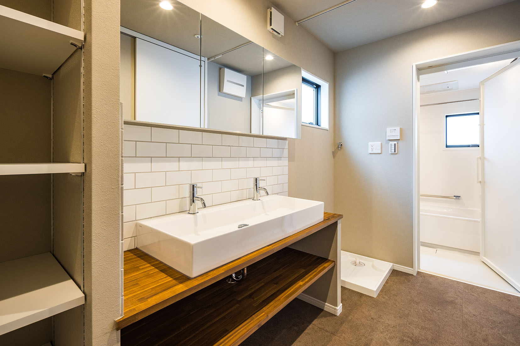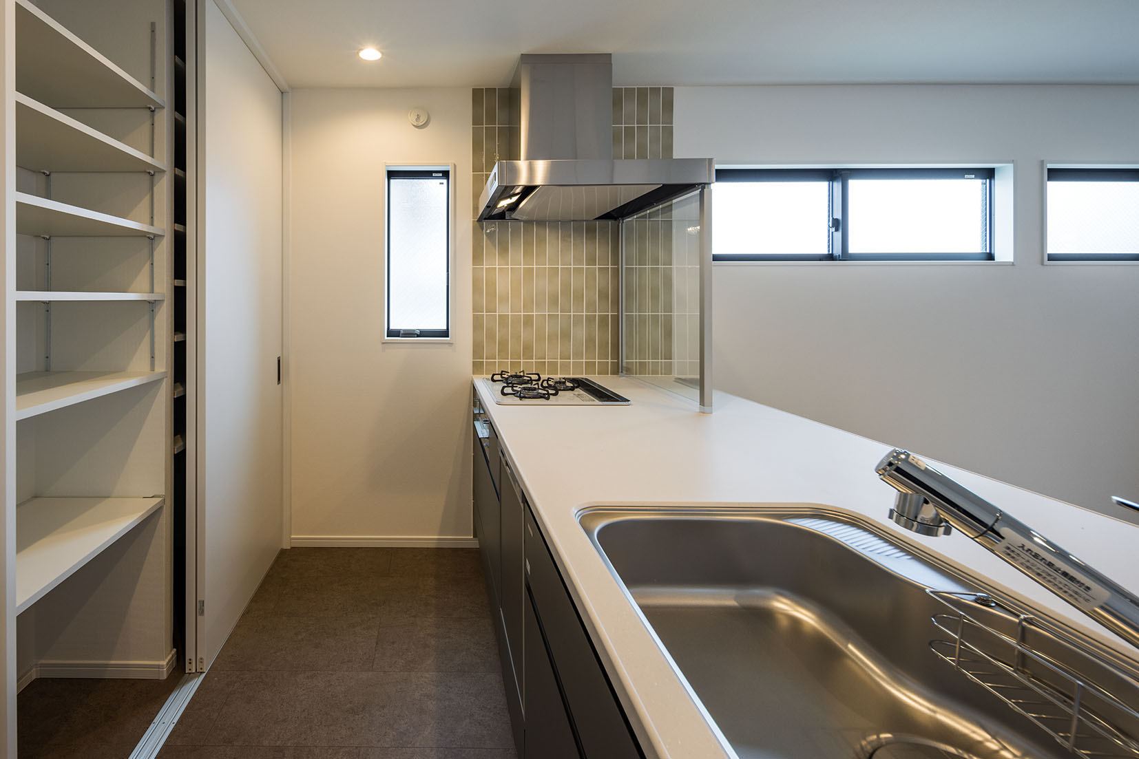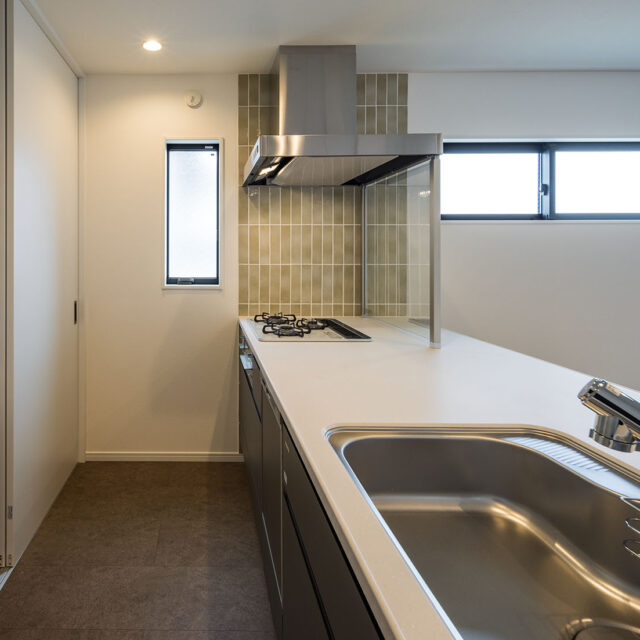 フラットで艶の美しいタイルと板張り天井で仕上げました。