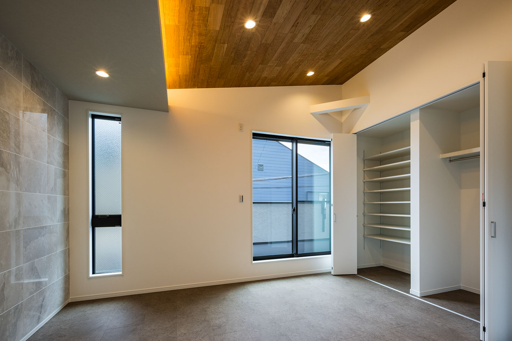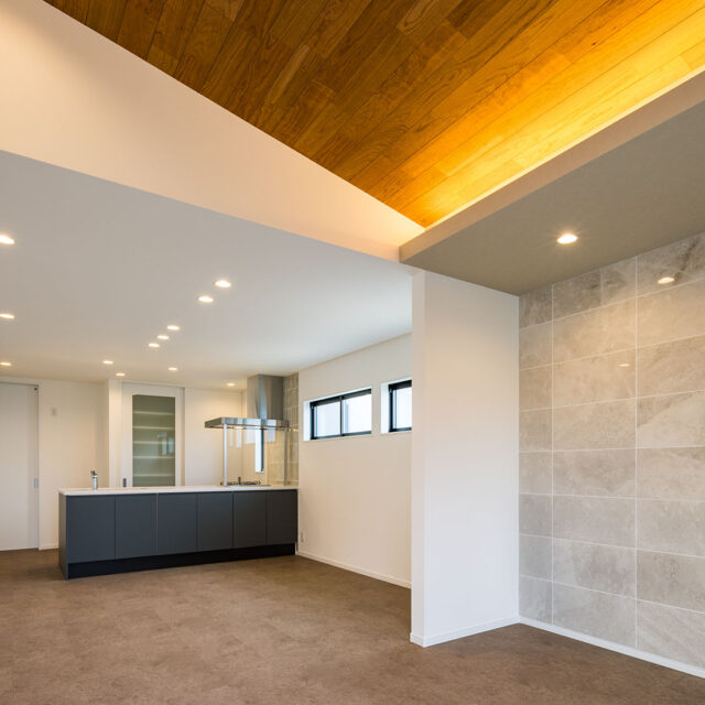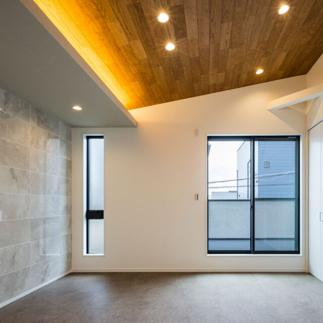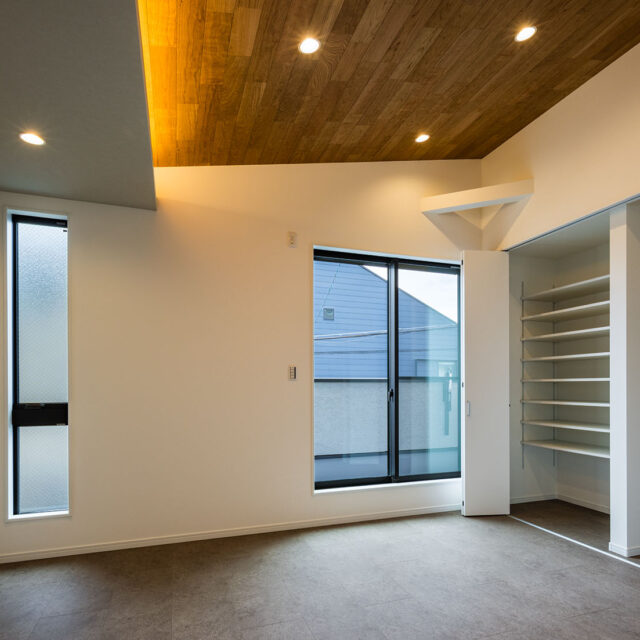 また、板を貼ることで、勾配天井を強調する仕上げにした。