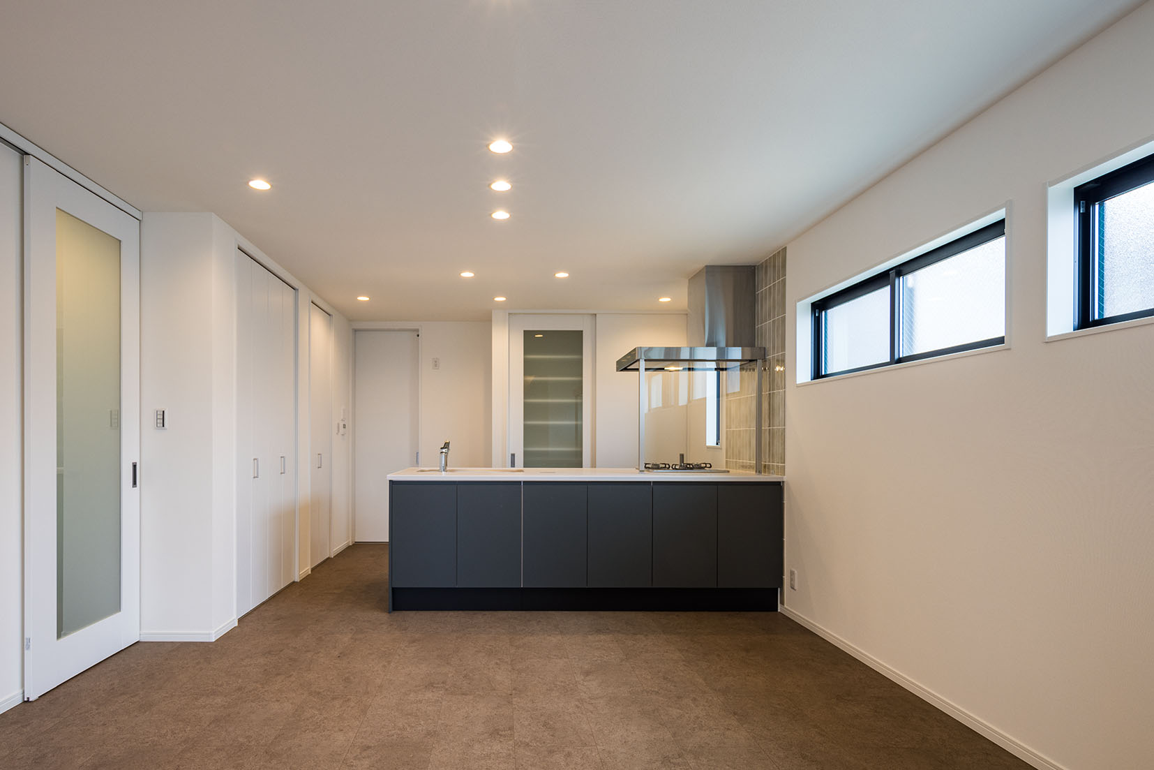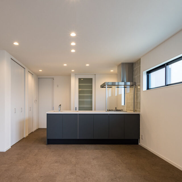 ストリップ階段が美しく見えるようにストレートで配置できる間取りにした。