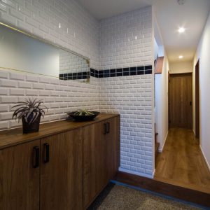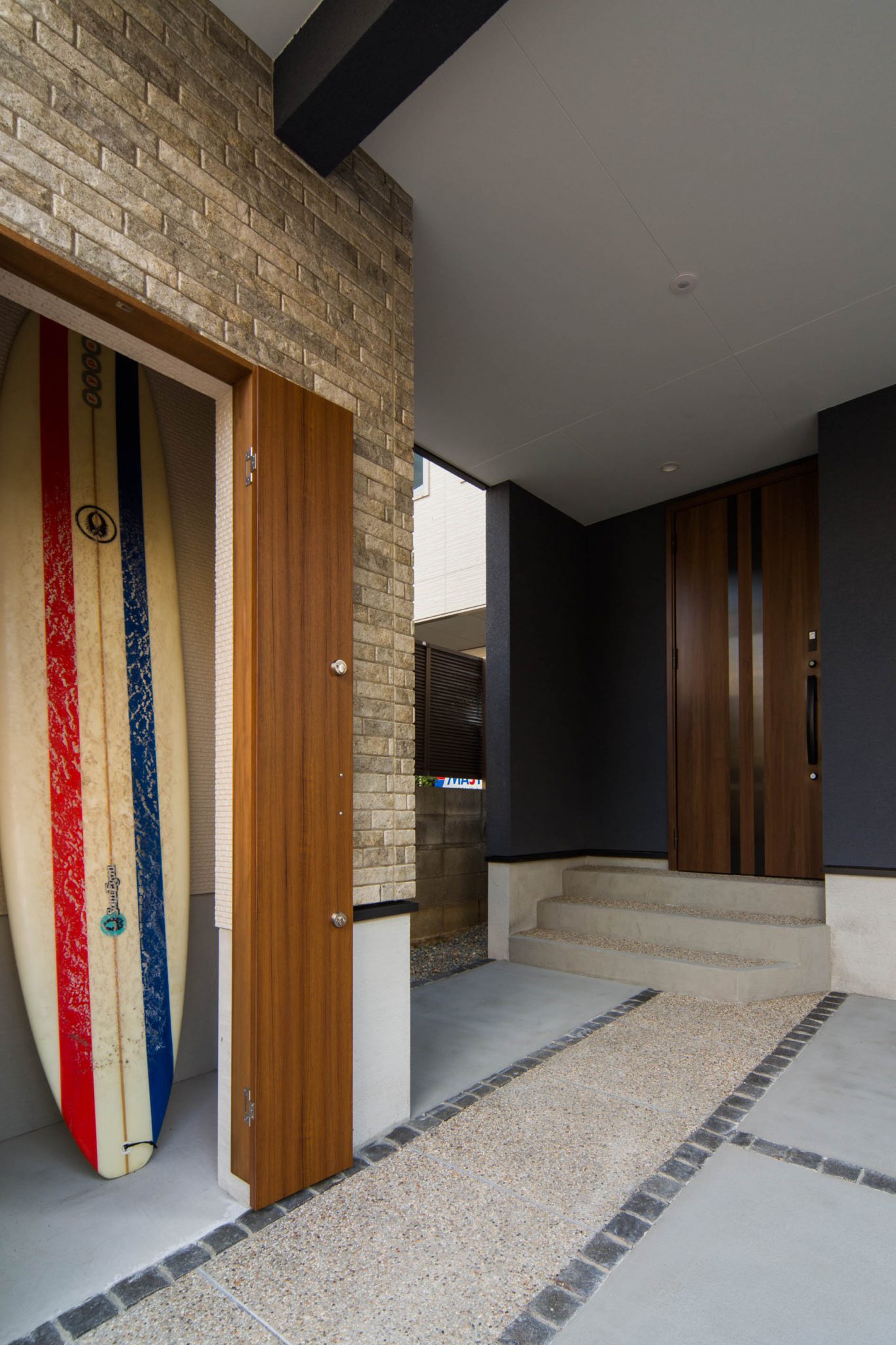構造上、どうしても必要な壁を利用して外部収納を設置。