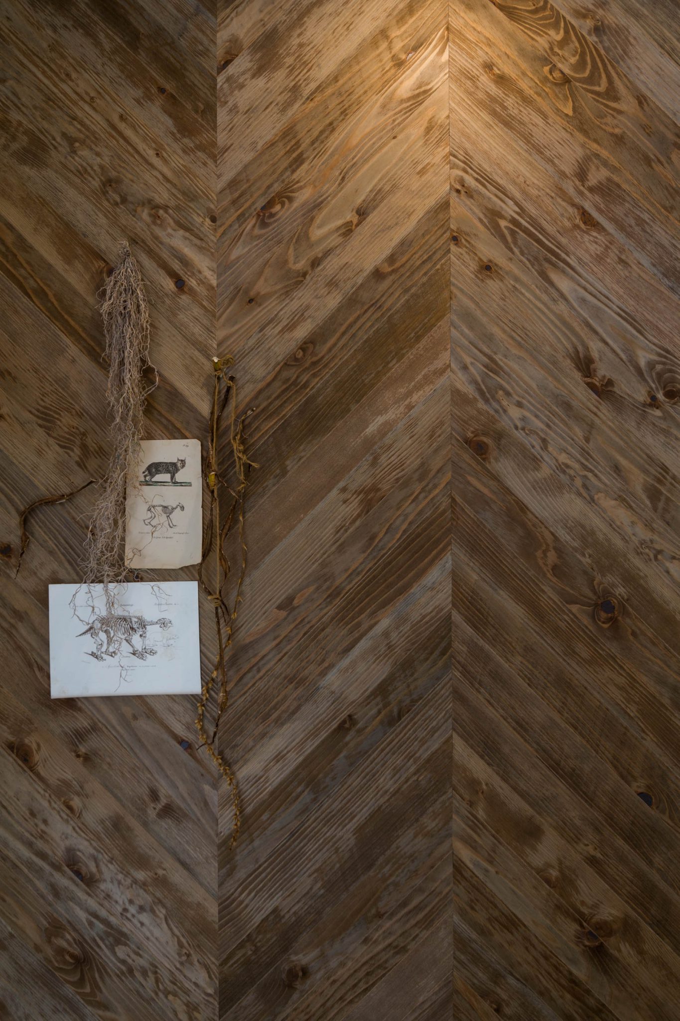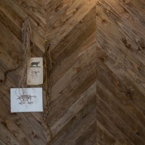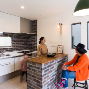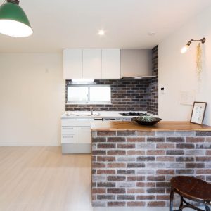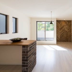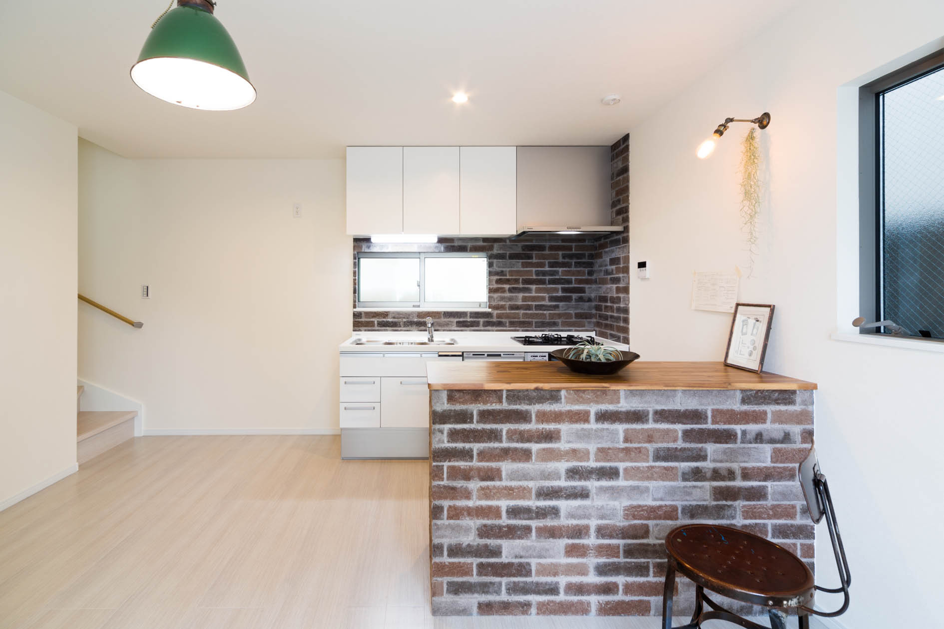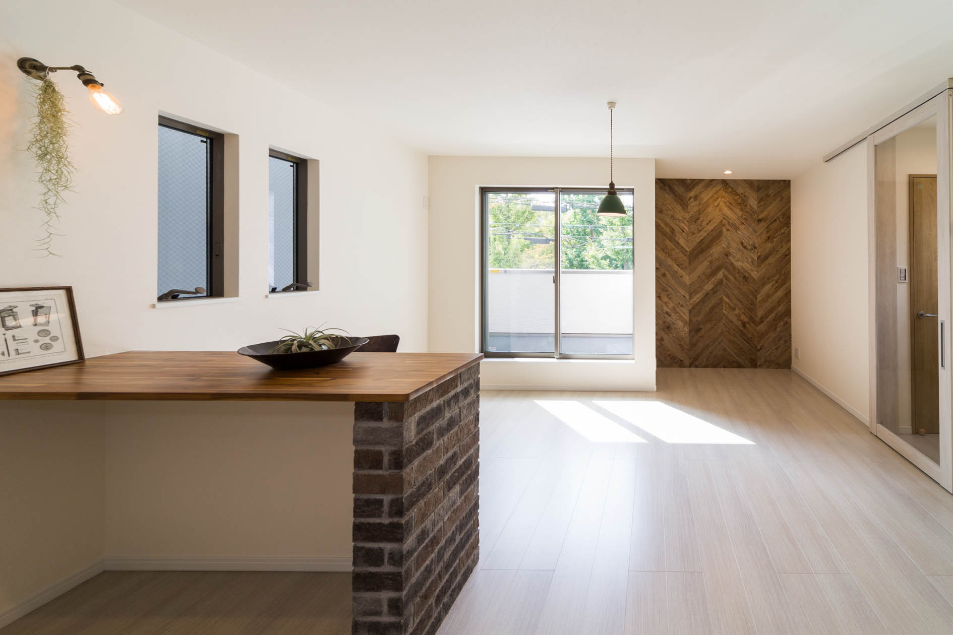 リビングの一面に貼ったフレンチヘリンボーンとキッチン、カウンターに貼ったレンガ調タイルで空間をまとめました。