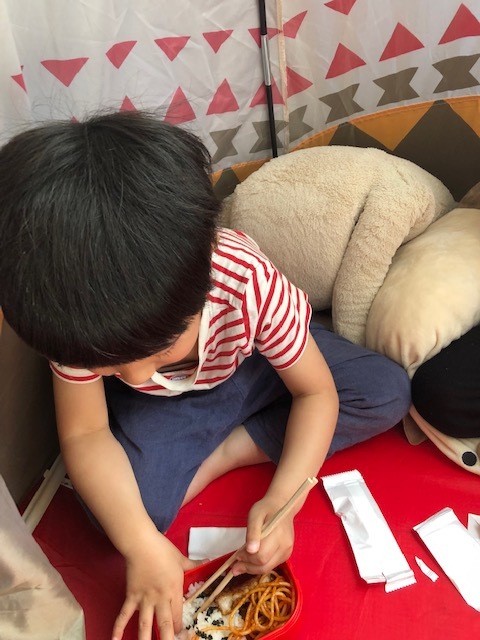 子供用テントを玄関先に置いて、キャンプごっこをしてみたり。